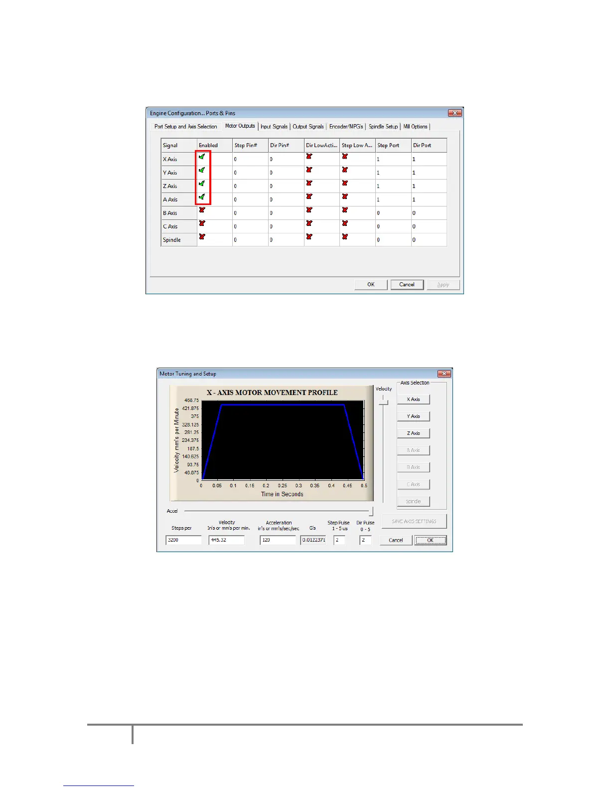 Follow the Mach3 motor tuning procedure to setup the appropriate values for ‘Steps per’, ‘Velocity’