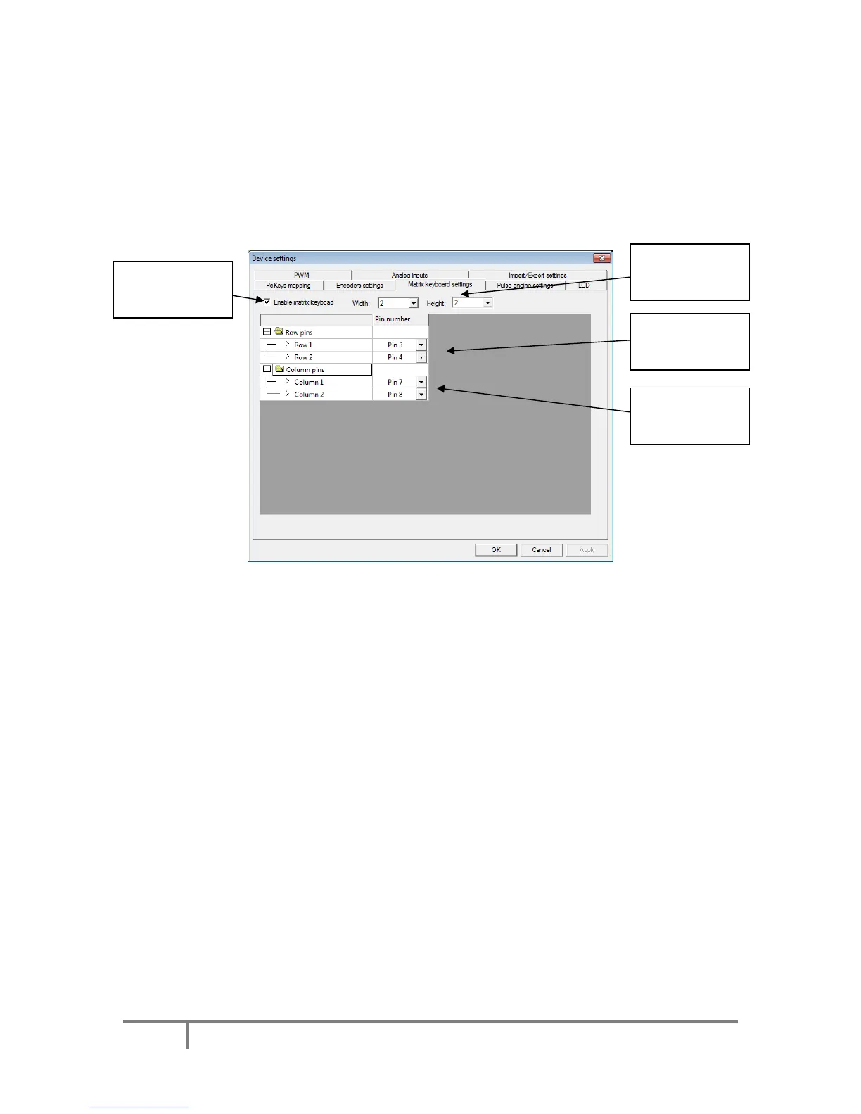 and assign PoKeys pins to matrix keyboard row and column connections.