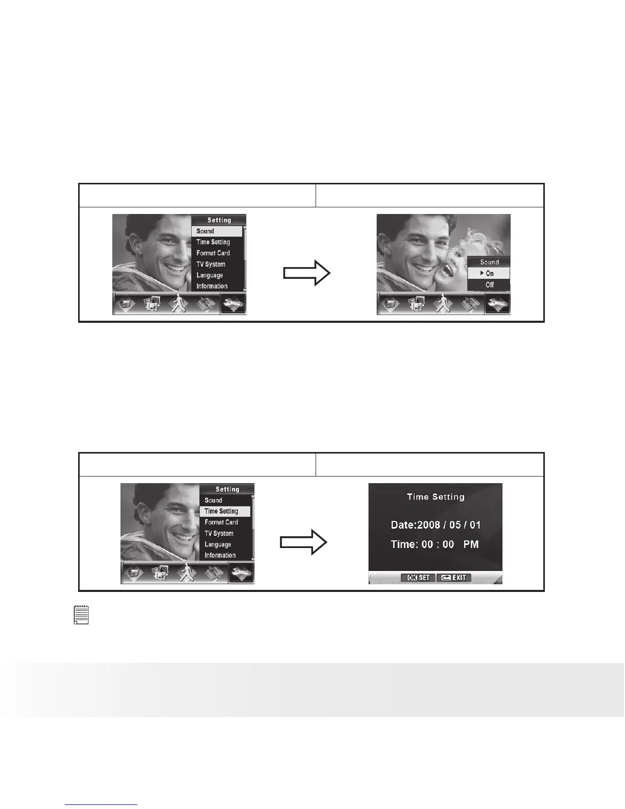 • Move between Date, Time, Set and Exit by using the Left/Right