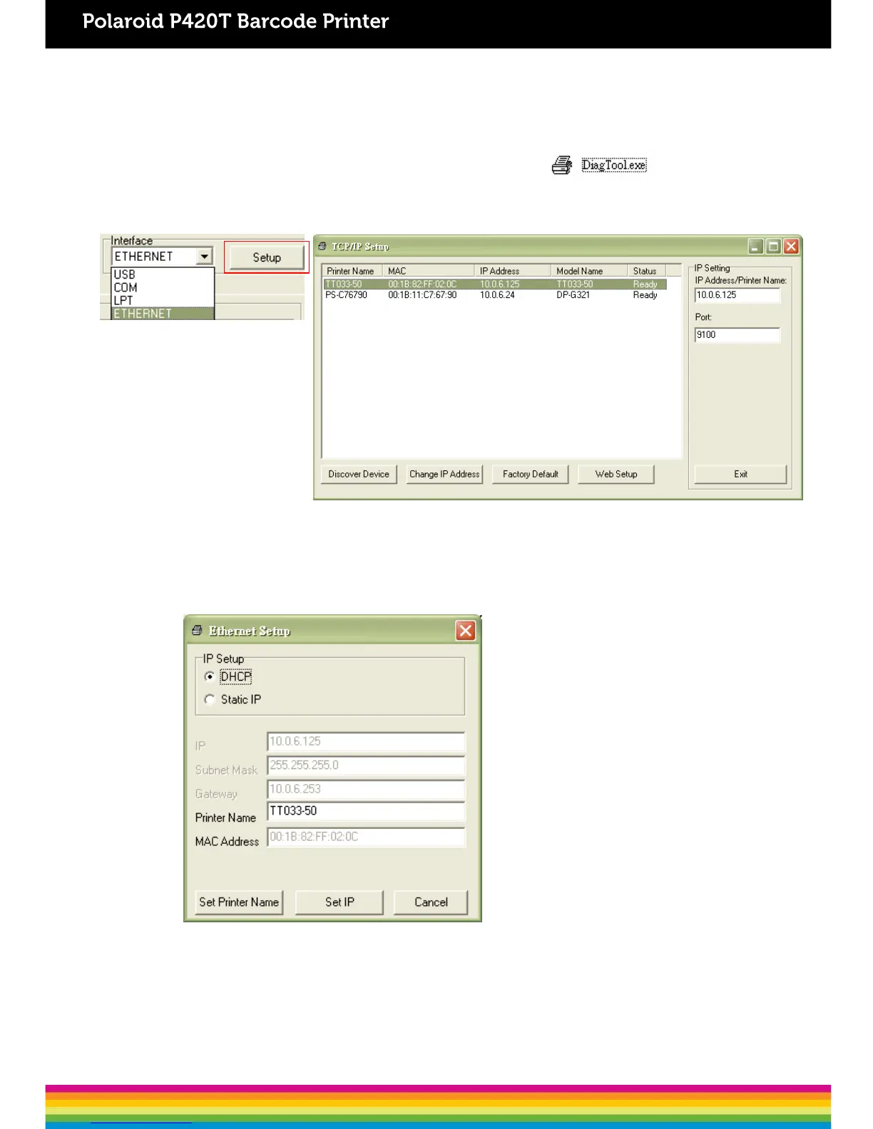 4. Select “Ethernet” as the interface then click on the “Setup” button to setup the IP address,