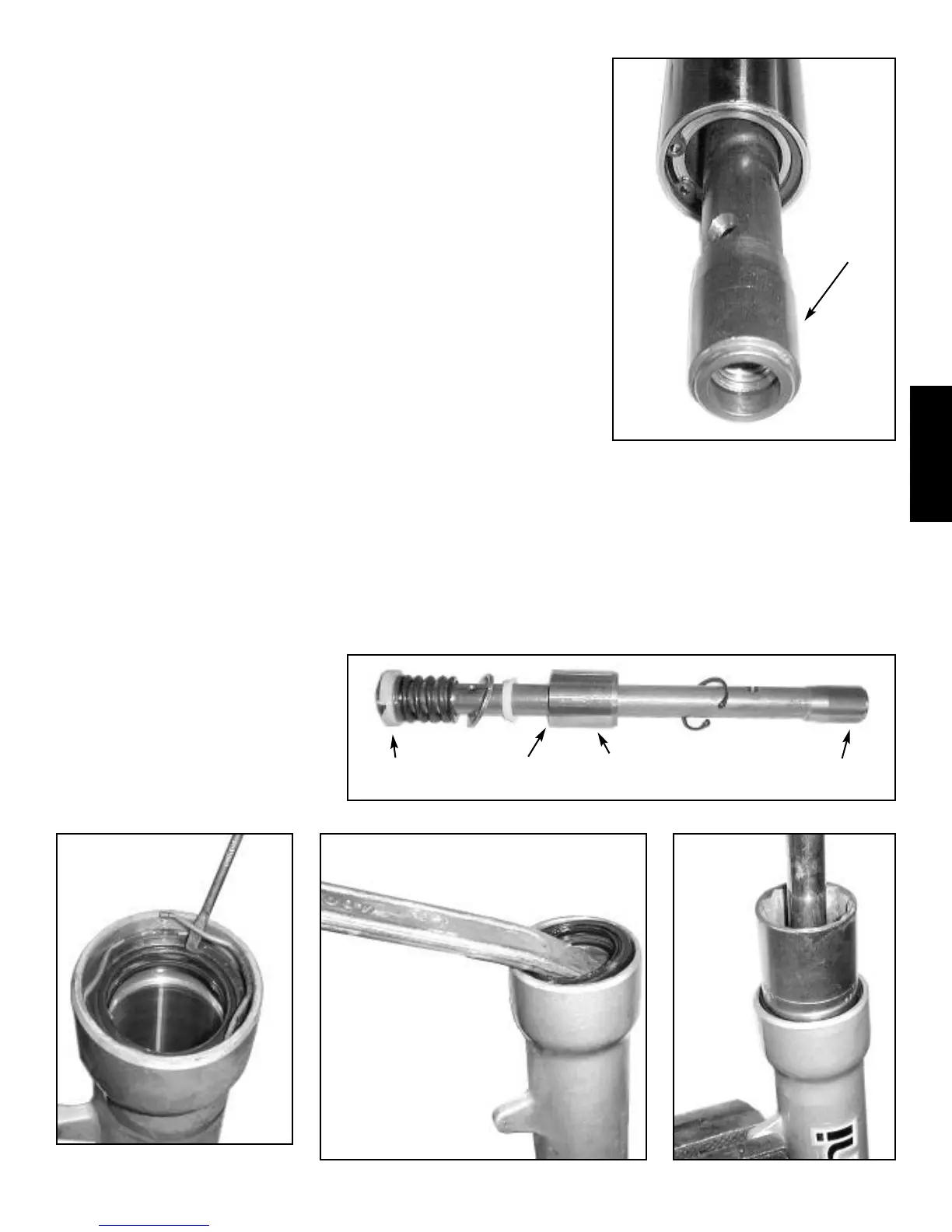 bushing, rebound spring and related parts. Inspect all parts for wear and damage. Replace as needed. See photos III-55 & III-56.