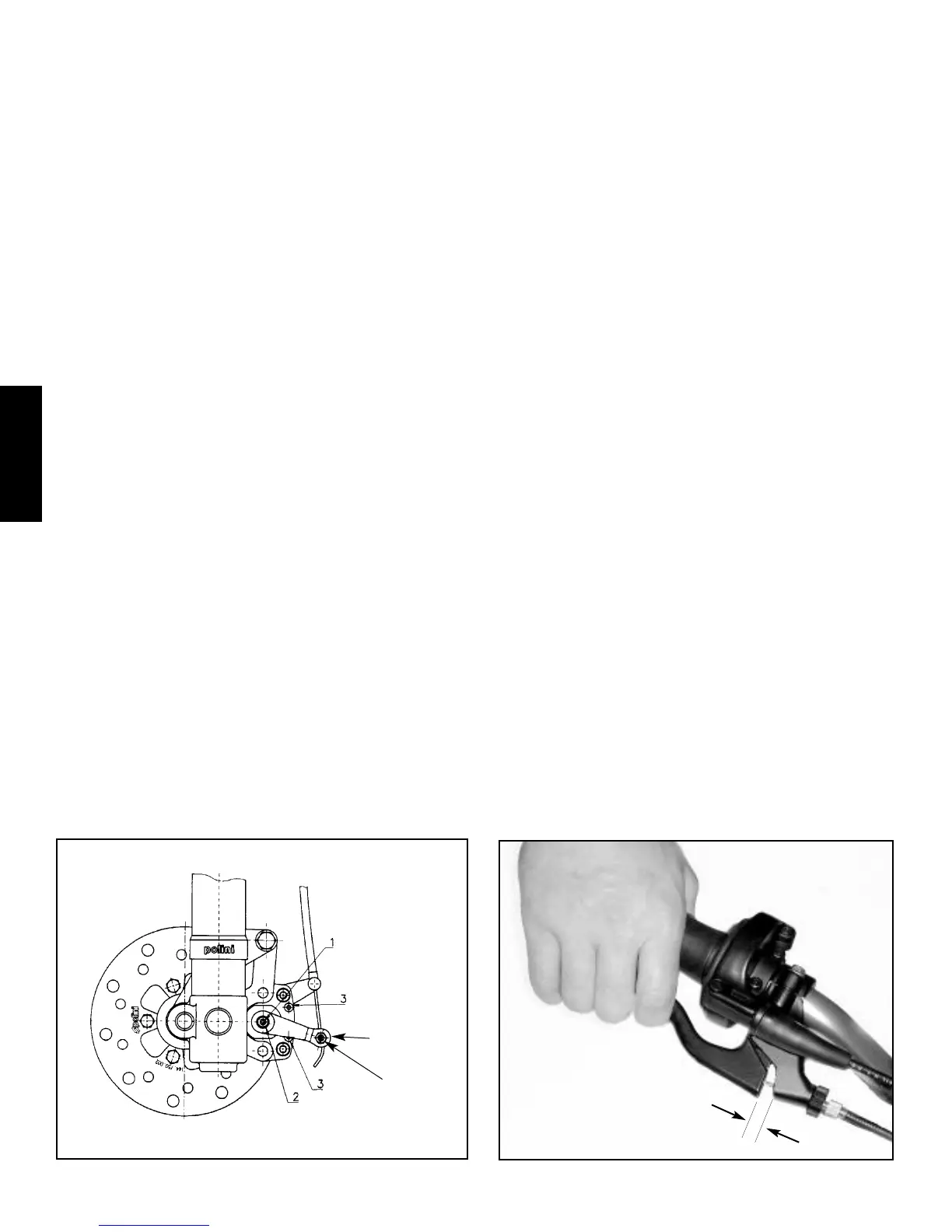 caliper, using the adjusting screw on the caliper and cable position adjustment. Replace brake pads when friction material is less than