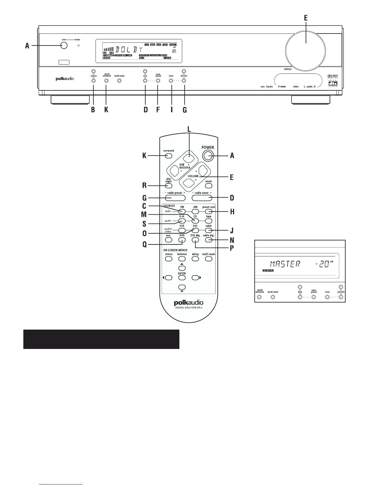 2. Press one of the SOURCE buttons (B) on the front panel or the AM or