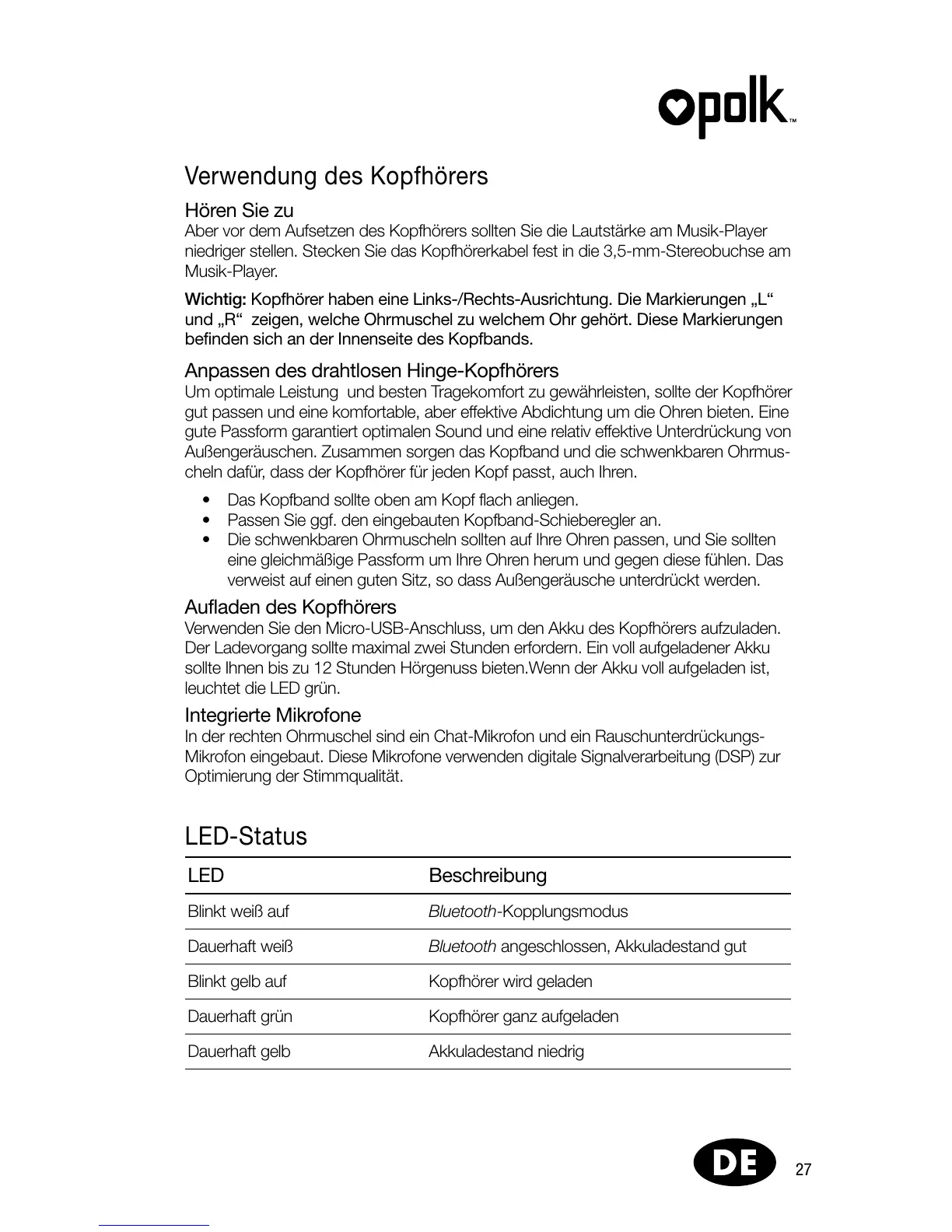 Um optimale Leistung und besten Tragekomfort zu gewährleisten, sollte der Kopfhörer