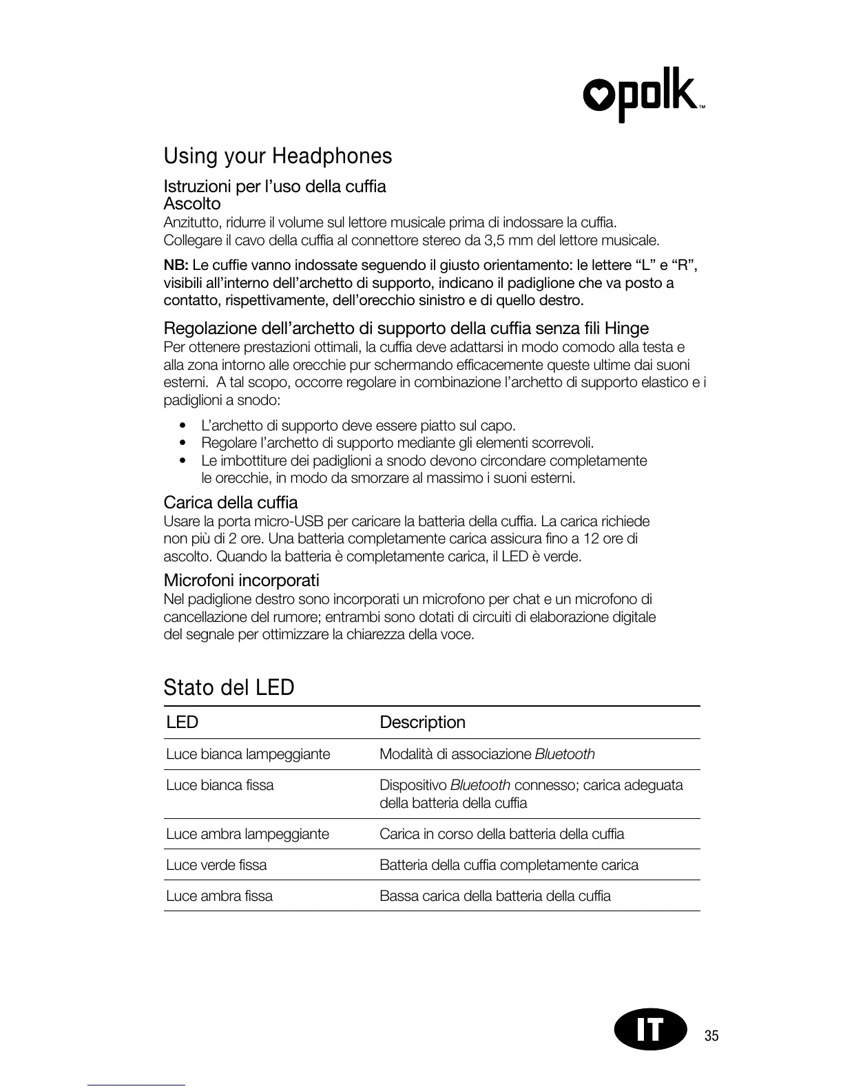 ascolto. Quando la batteria è completamente carica, il LED è verde.