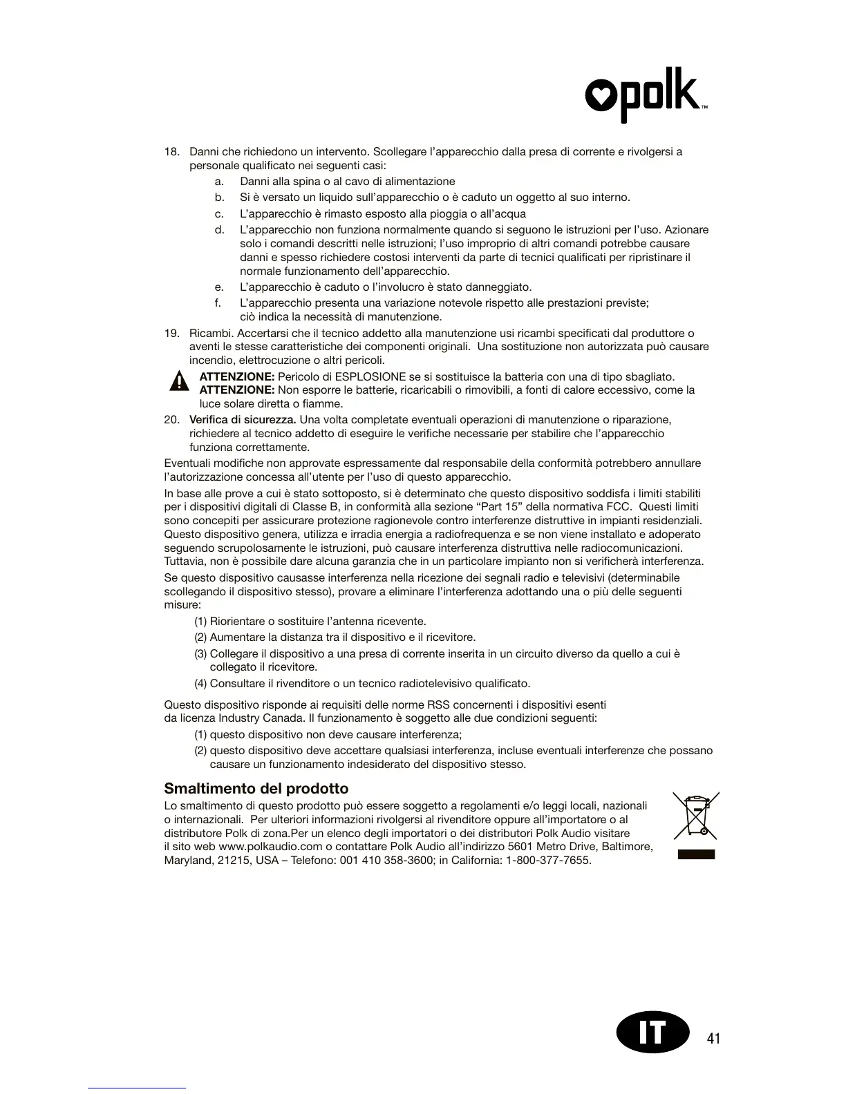 il sito web www.polkaudio.com o contattare Polk Audio all’indirizzo 5601 Metro Drive, Baltimore,
