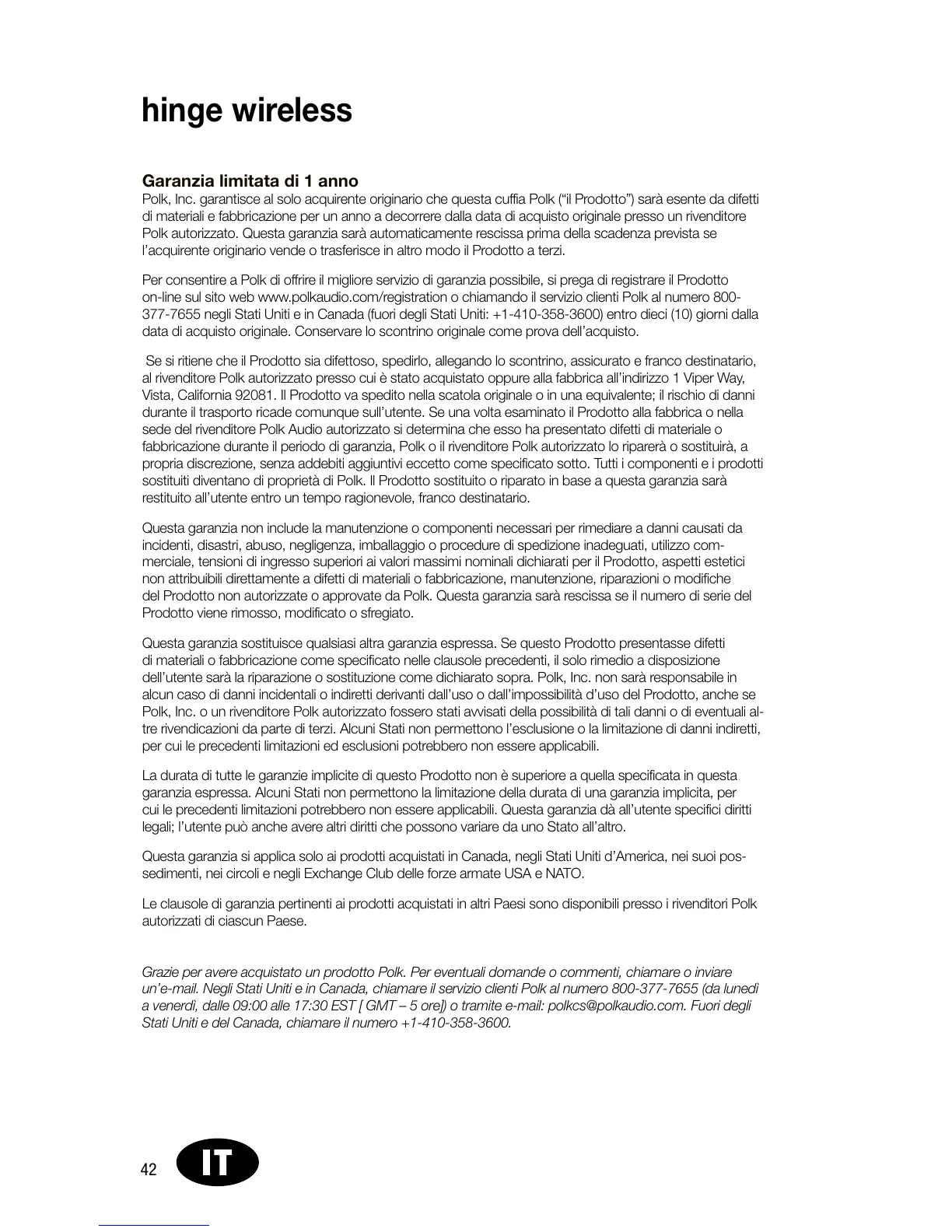 Grazie per avere acquistato un prodotto Polk. Per eventuali domande o commenti, chiamare o inviare