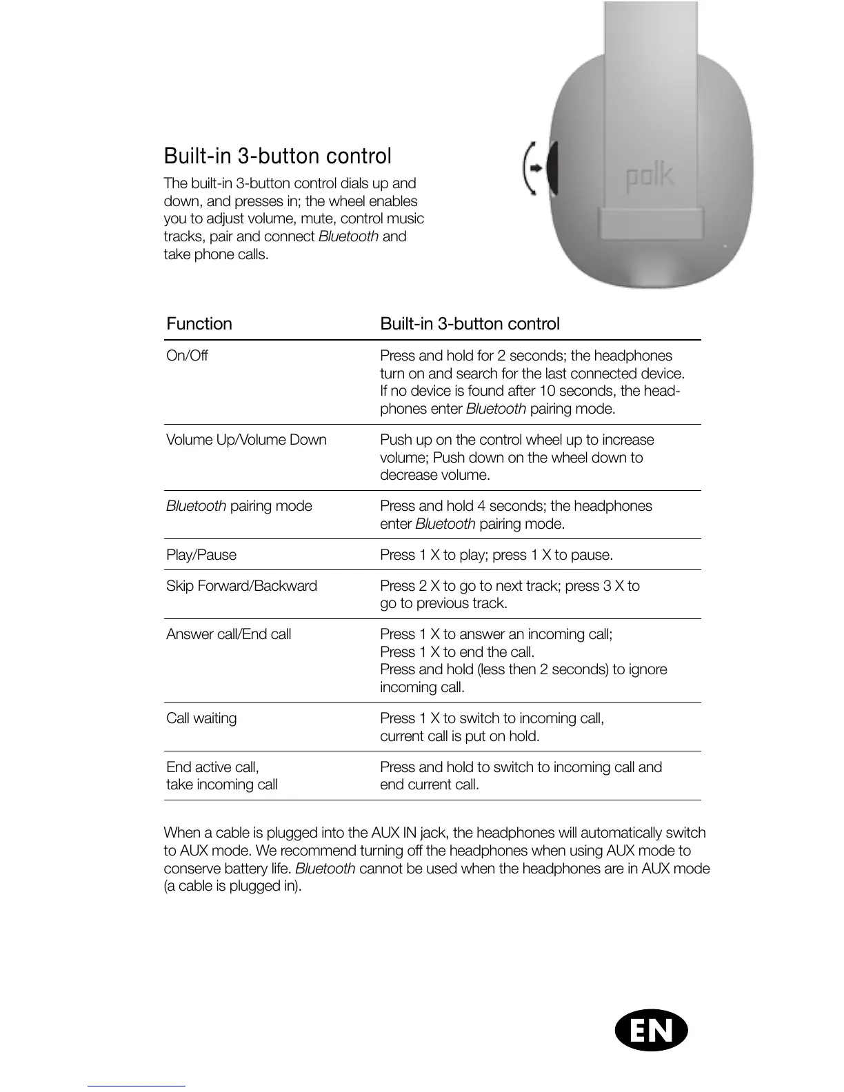 conserve battery life. Bluetooth cannot be used when the headphones are in AUX mode