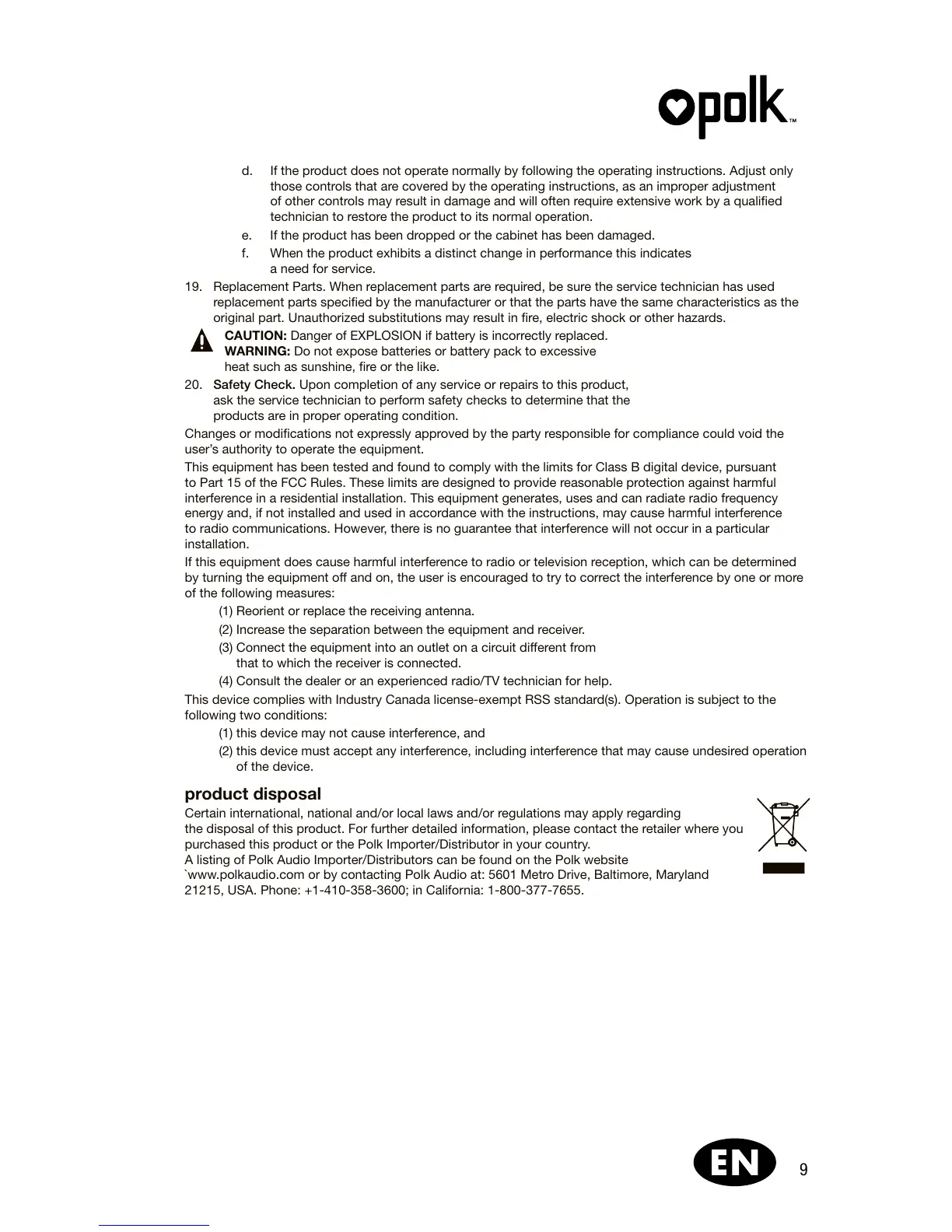 `www.polkaudio.com or by contacting Polk Audio at: 5601 Metro Drive, Baltimore, Maryland