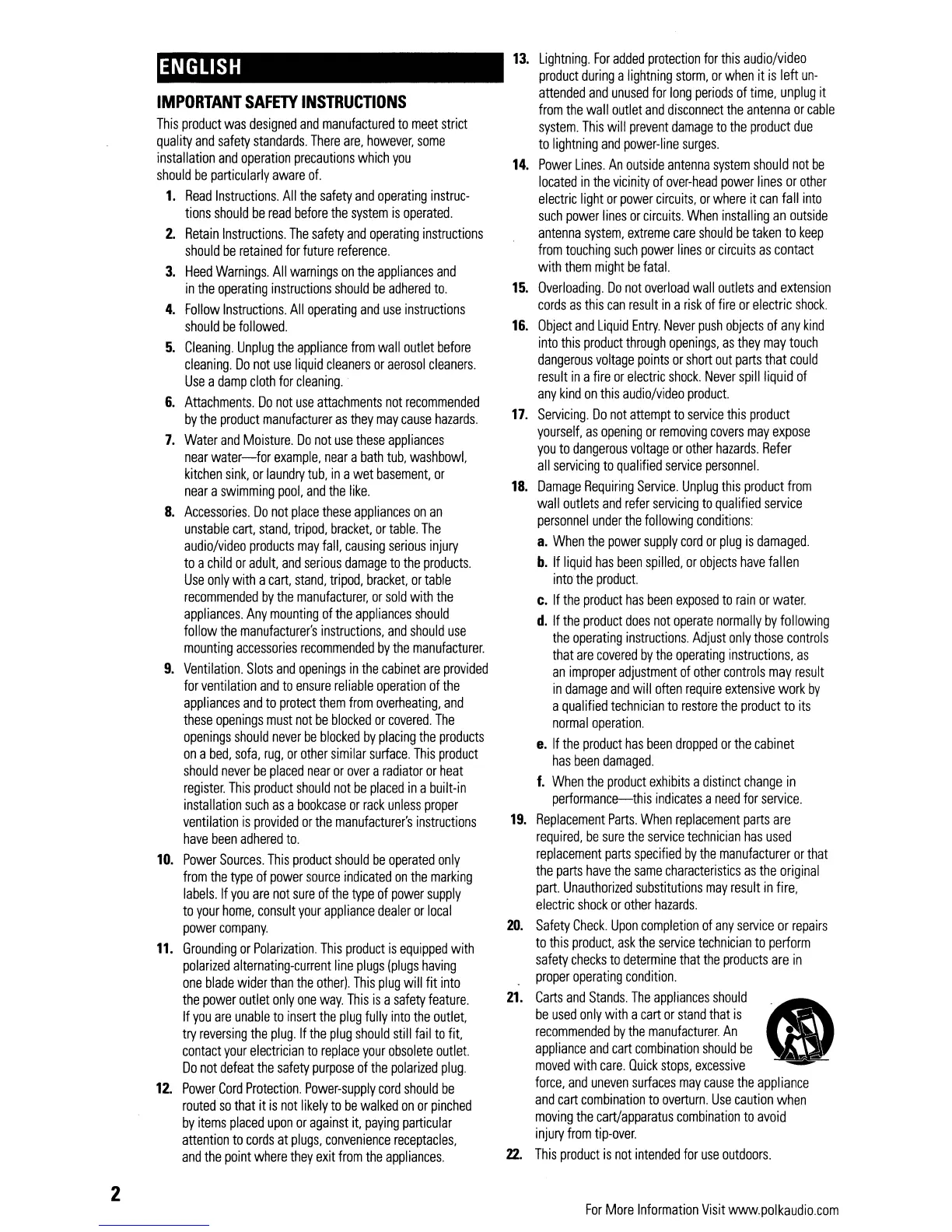 Polk Audio OWM3 - Important Safety Instructions; General Operation and Cleaning; Electrical and Environmental Safety; Installation and Placement Precautions