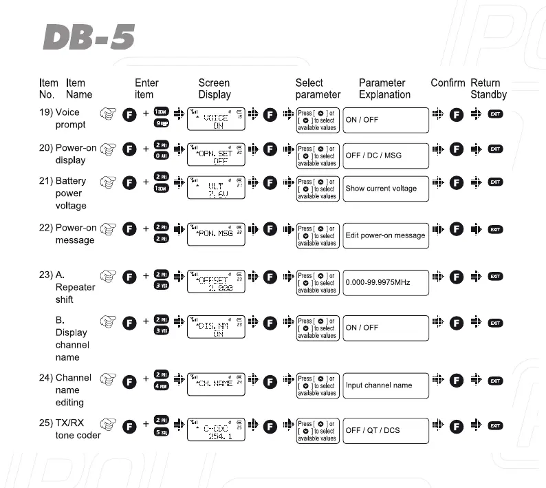 POLMAR DB-5 - Voice Prompt and Power-on Settings Shortcuts; Repeater Shift and Channel Name Shortcuts; Tone Coder Shortcuts