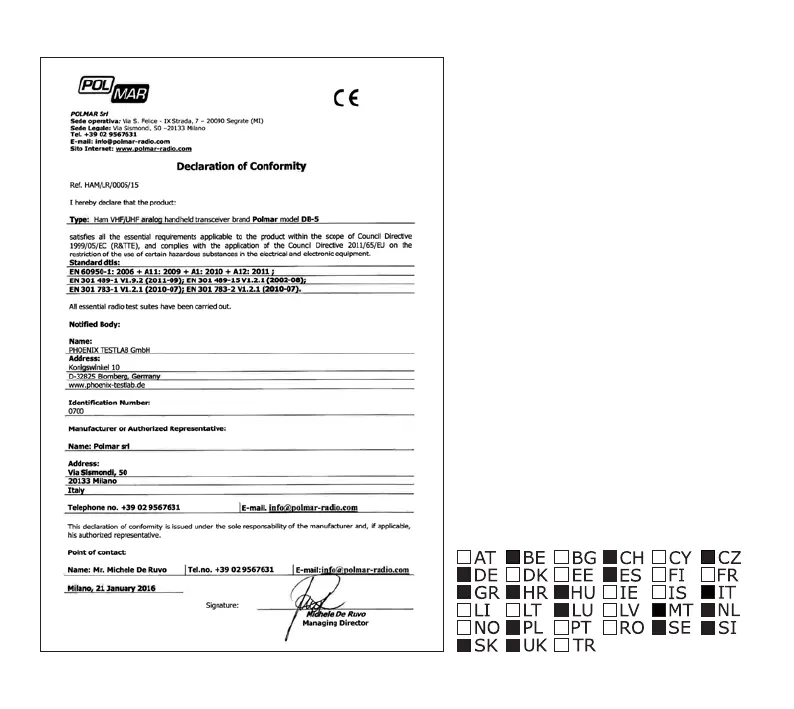 POLMAR DB-5 - Declaration of Conformity; Product Type and Essential Requirements; Notified Body and Manufacturer Details; Declaration Details and Contact