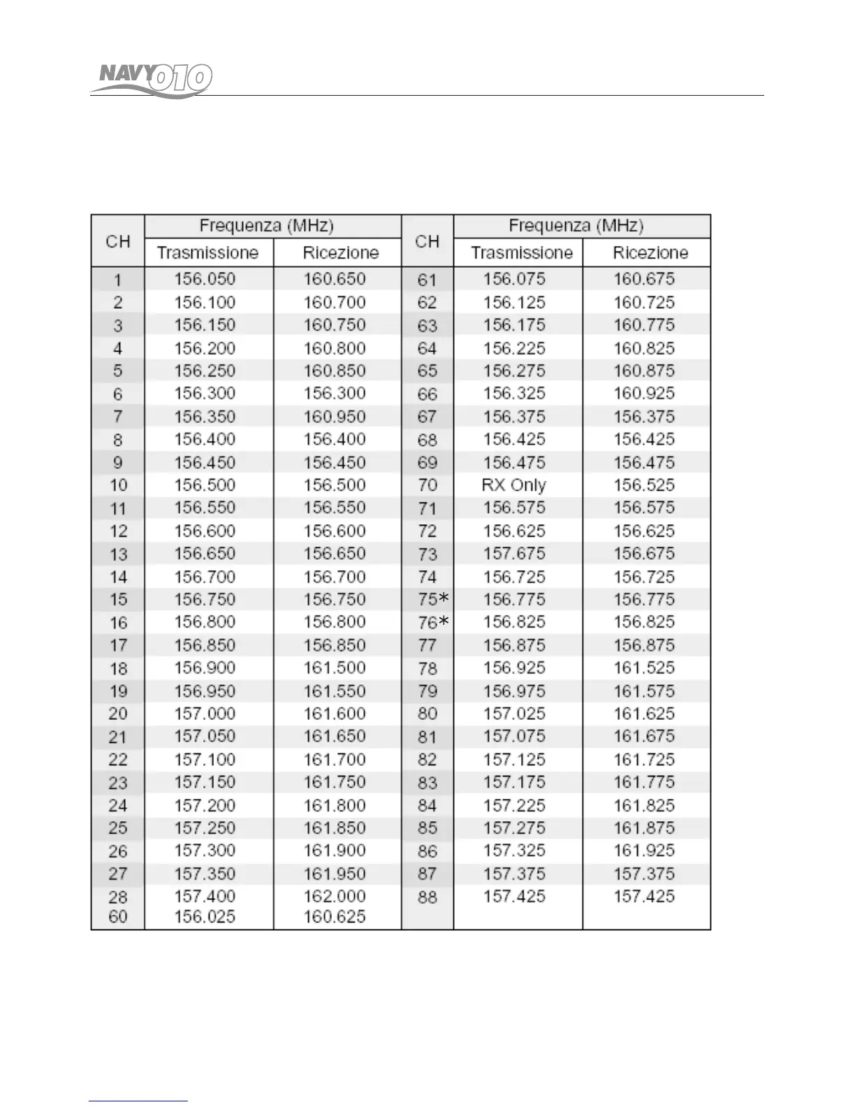 Tabella delle frequenze operative e relativi canali Marini.