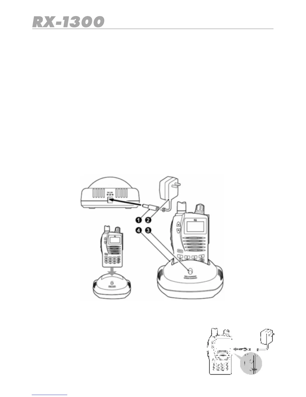 4. Insert the receiver into the charging cradle until it ‘clicks’ home. The charging LED will