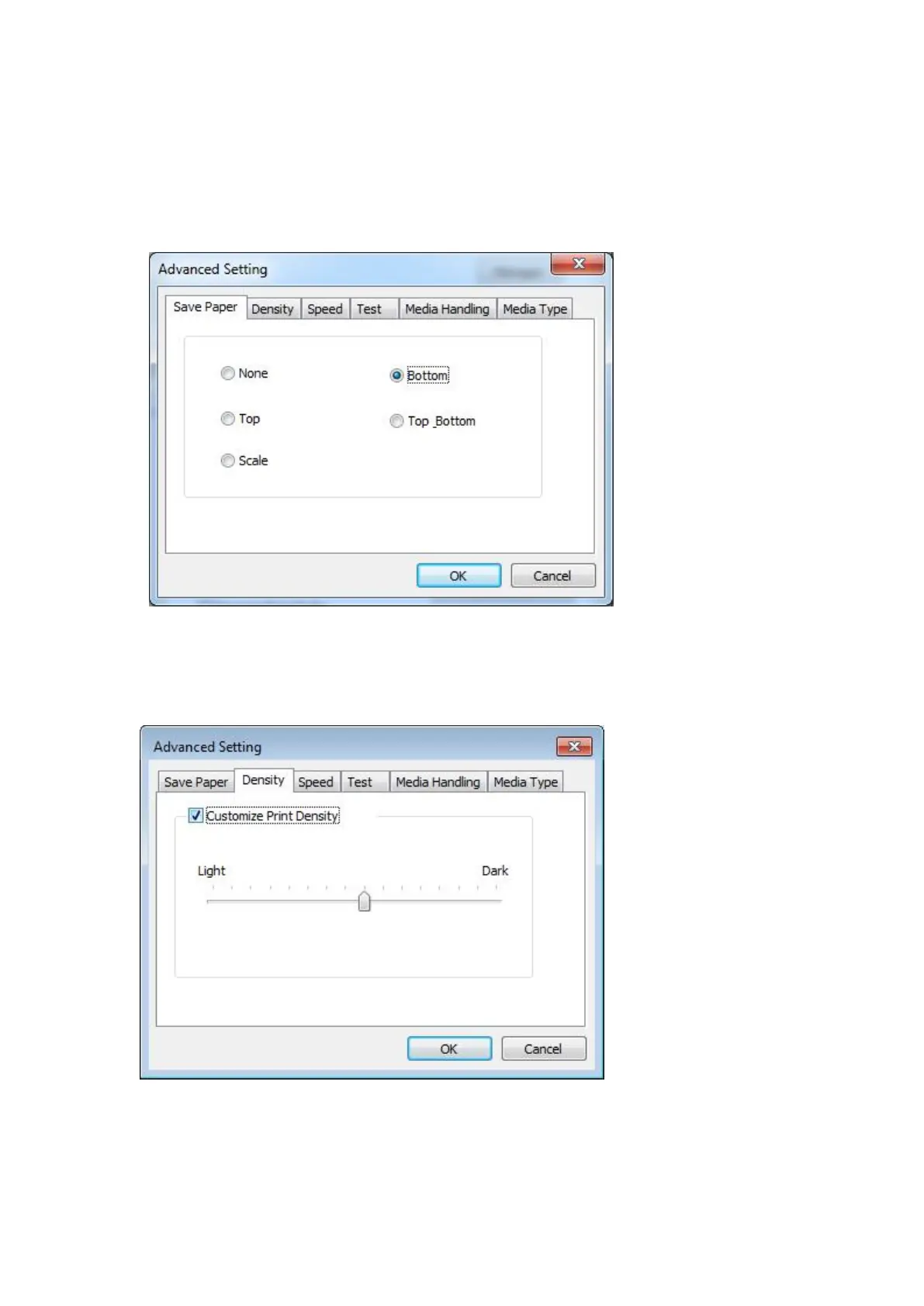 ●Click Advanced” to set “Save Paper, “Density, Speed”, Test, “Media Handling,