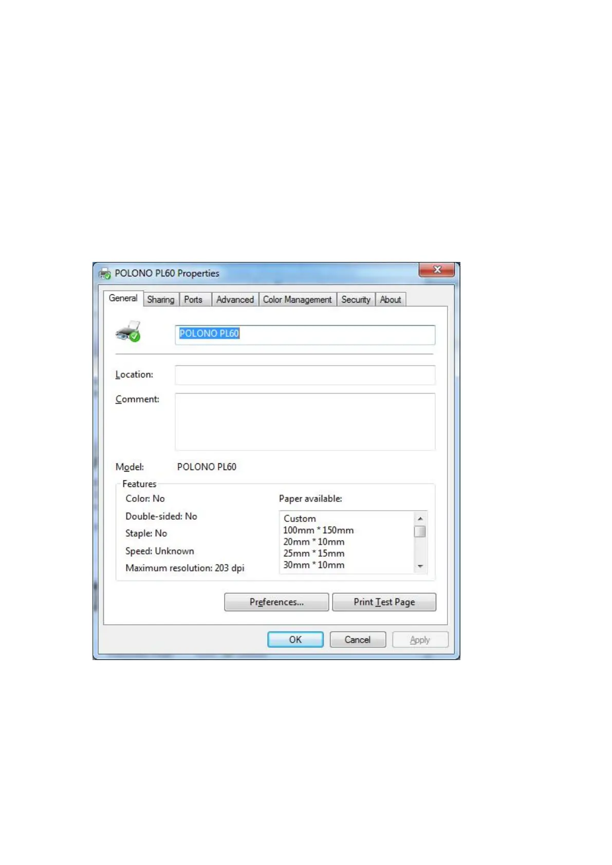 2.Click “General” “Print Test Page”, and the printer will print labels with the