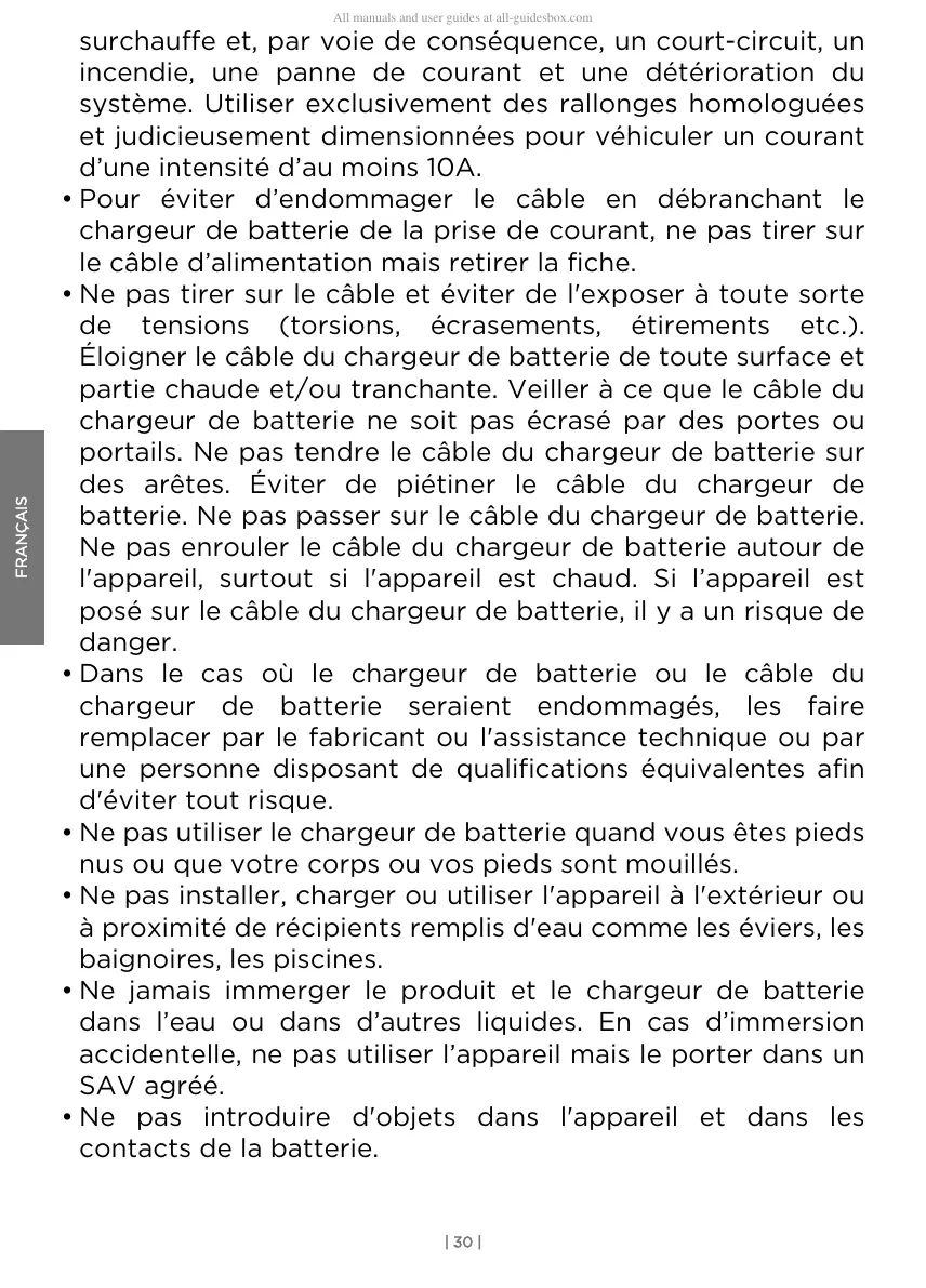 batterie. Ne pas passer sur le câble du chargeur de batterie.