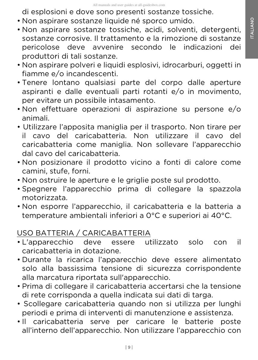 • Non aspirare polveri e liquidi esplosivi, idrocarburi, oggetti in