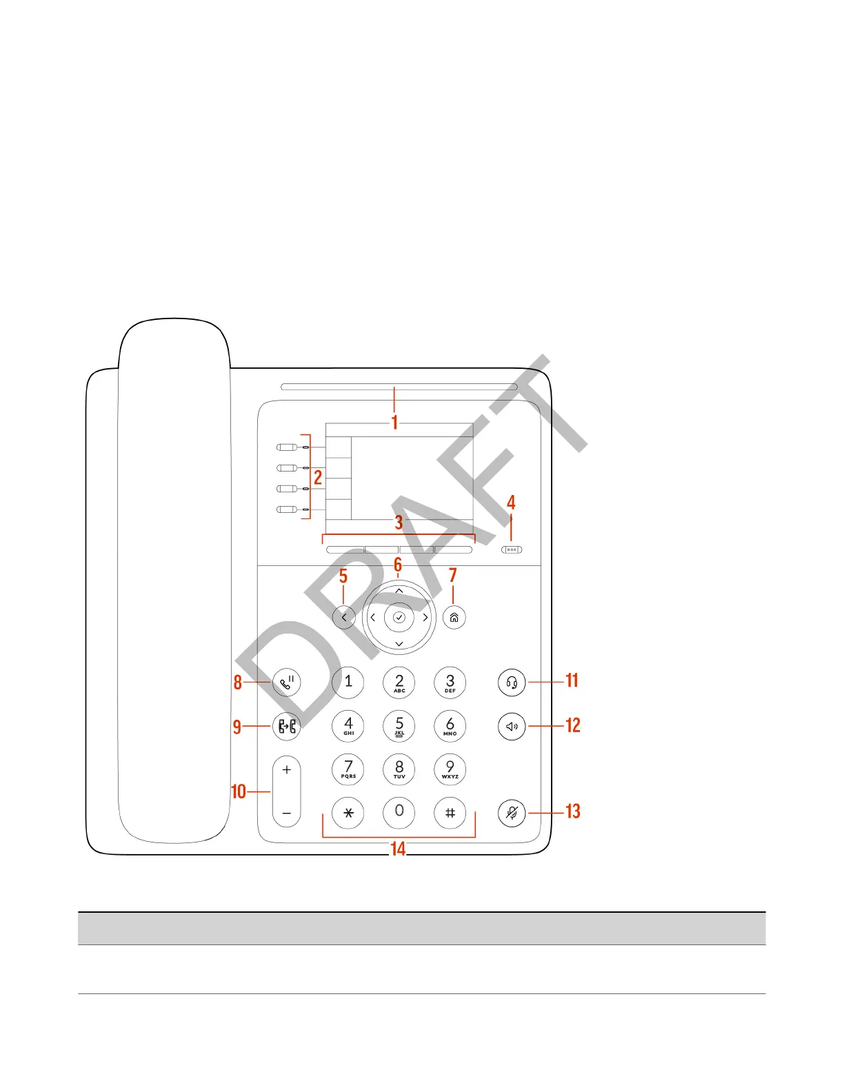 The following figure displays the hardware features on Poly Edge E100 and Edge E220 phones. The table lists each