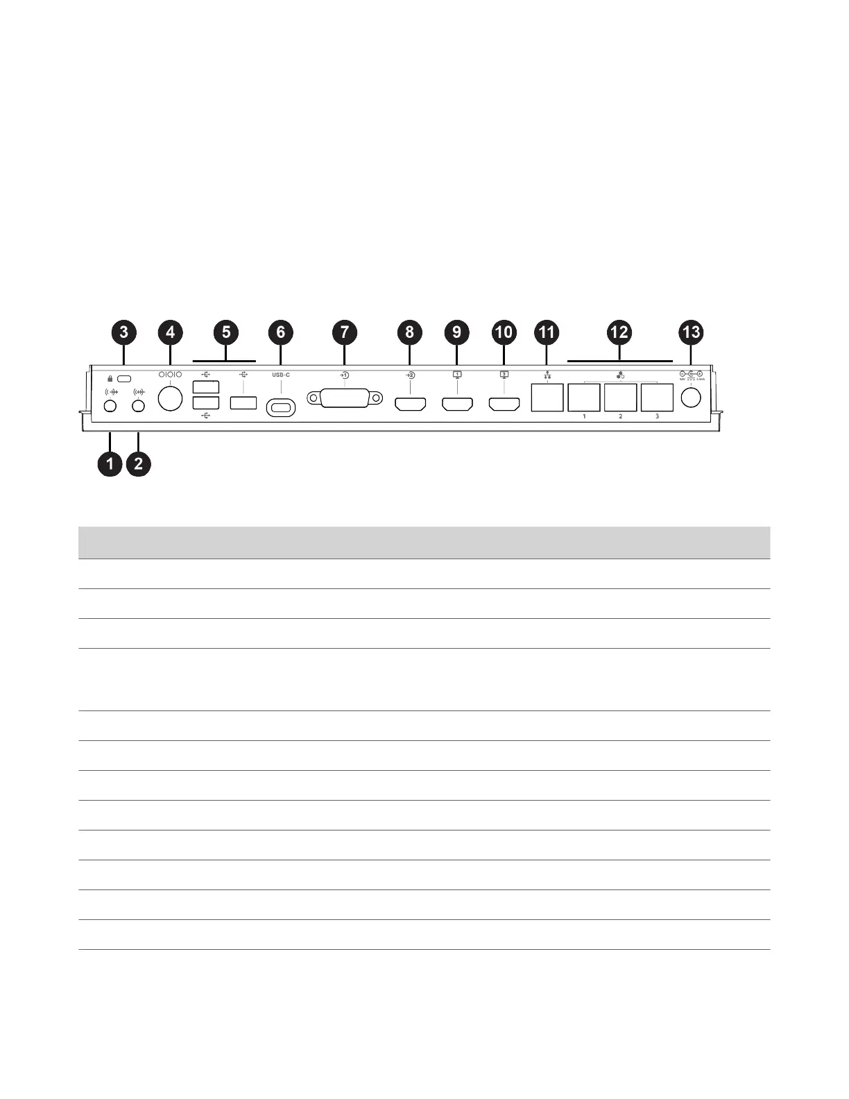The following illustration and table explain the hardware ports on your Poly Studio X70 system.