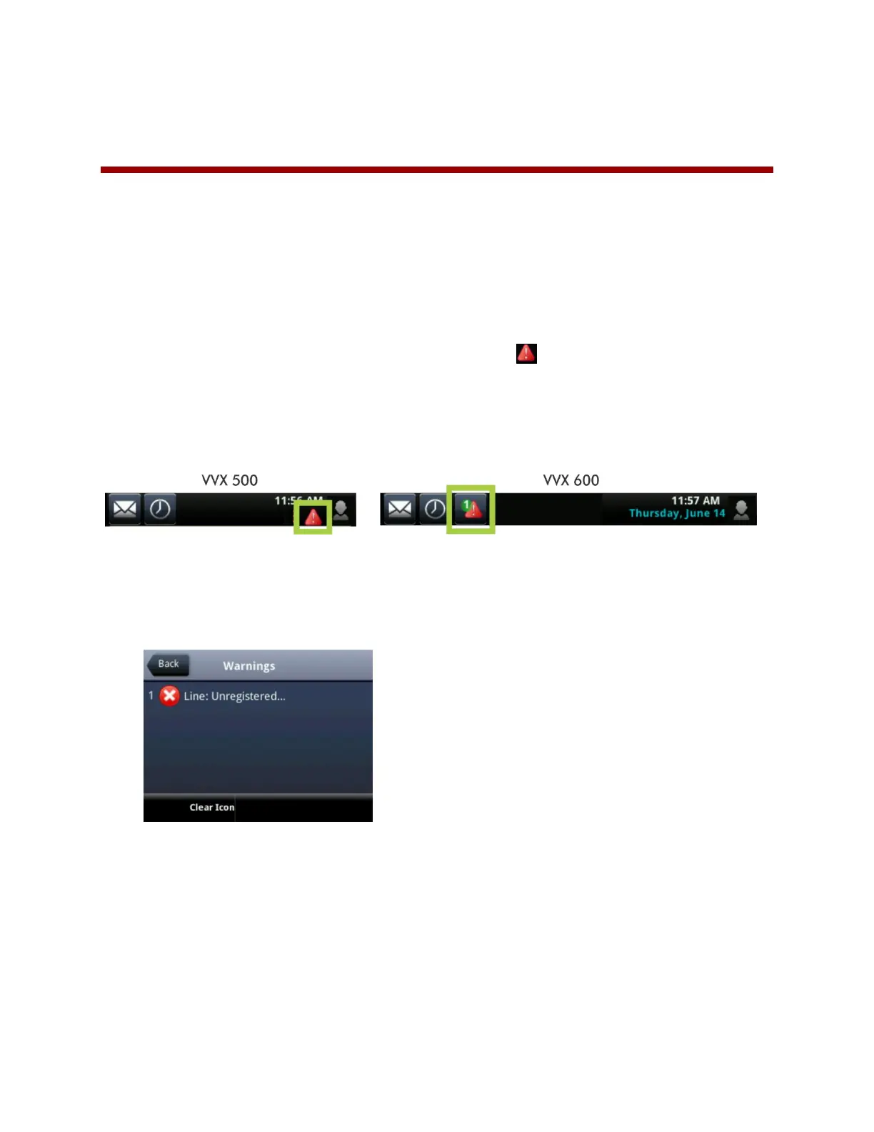 view details about the issues from the Warnings screen. If you have a VVX 600, the icon will have a
