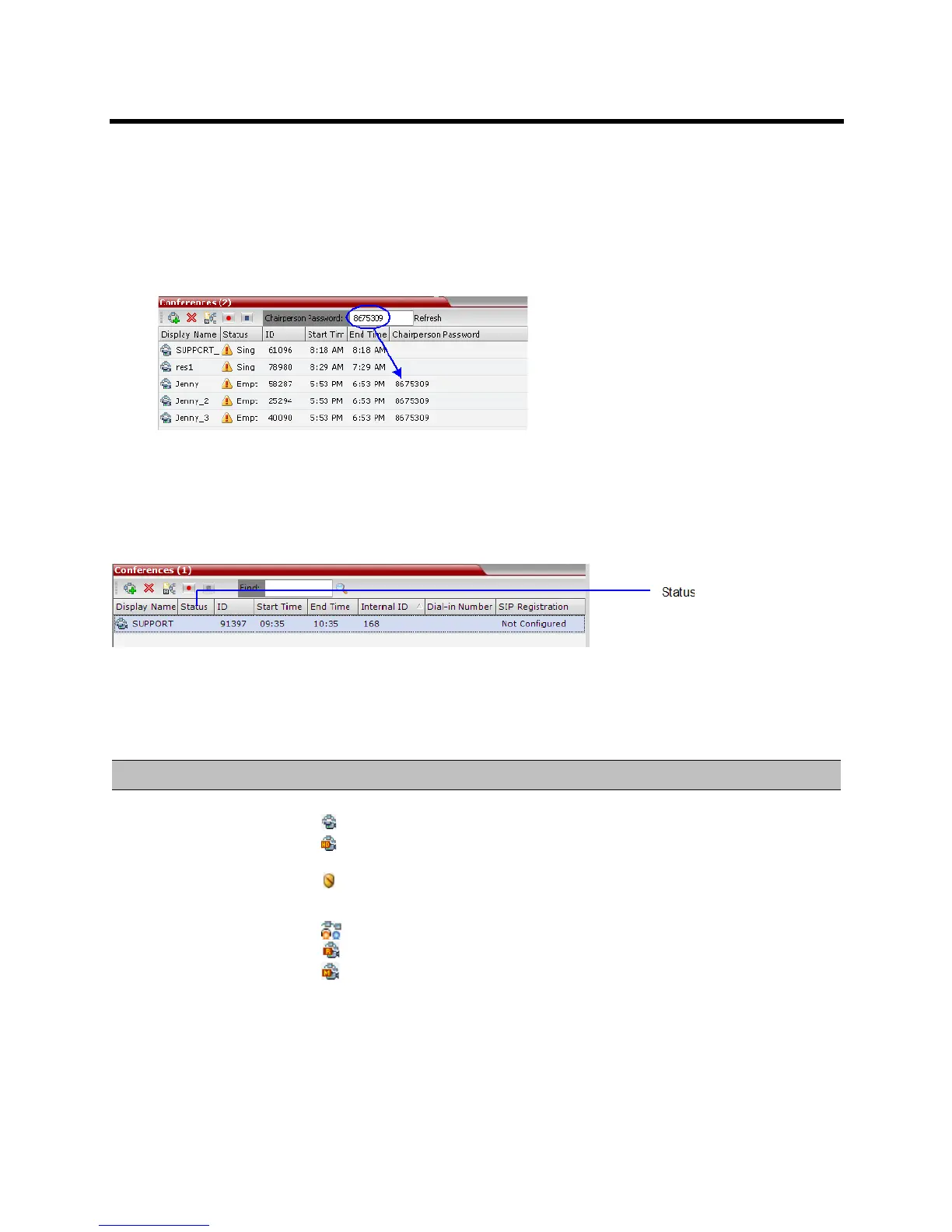 No status indicator display in the Status column means that the conference is running without problems.