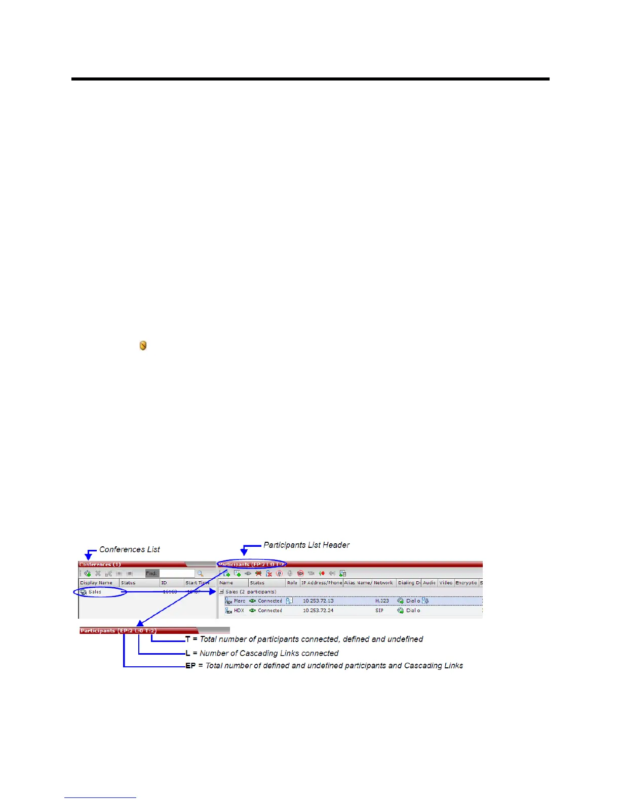 When a conference is selected in the Conference list, the Participants list header displays a summary of