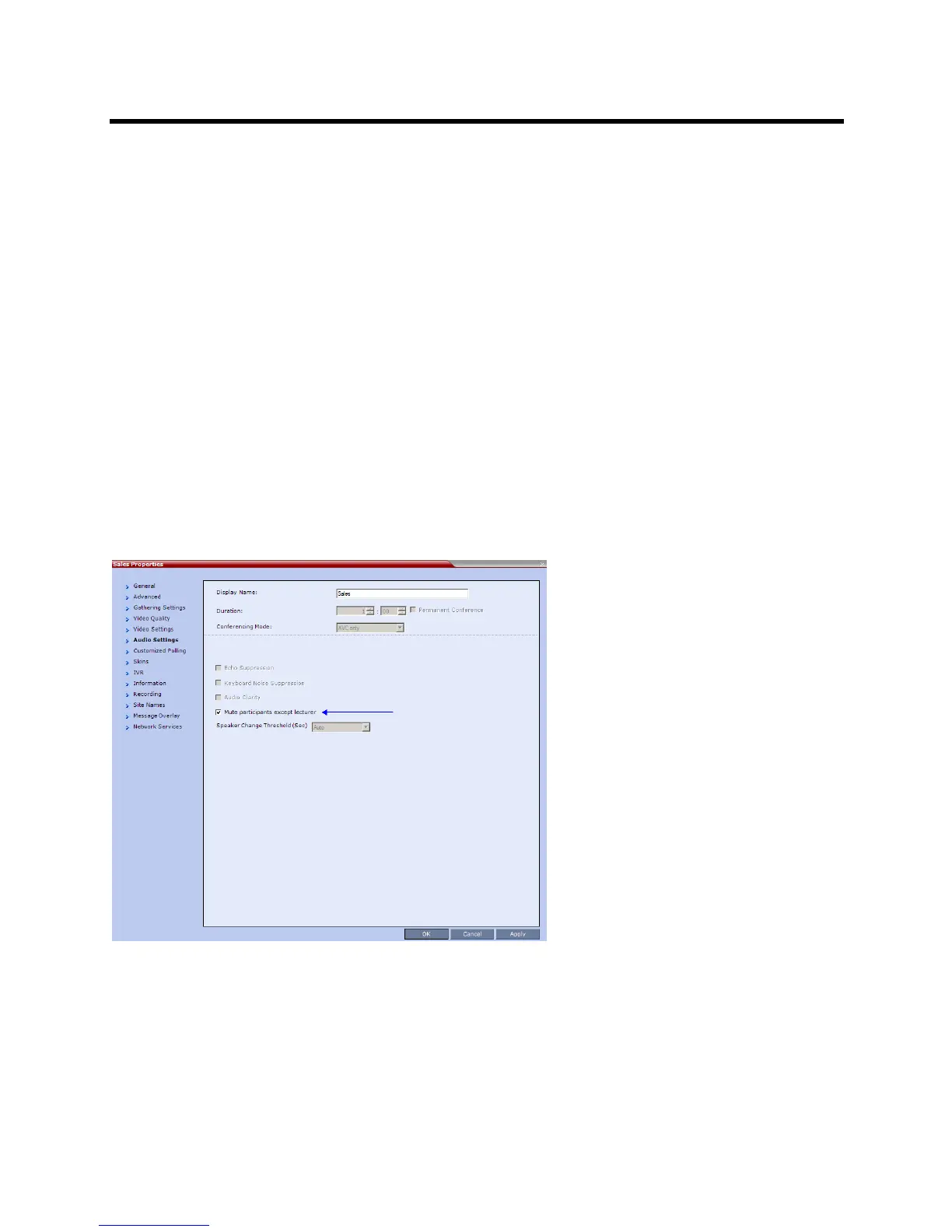 The Mute Participants Except Lecturer option is enabled or disabled in the Conference Properties - Audio