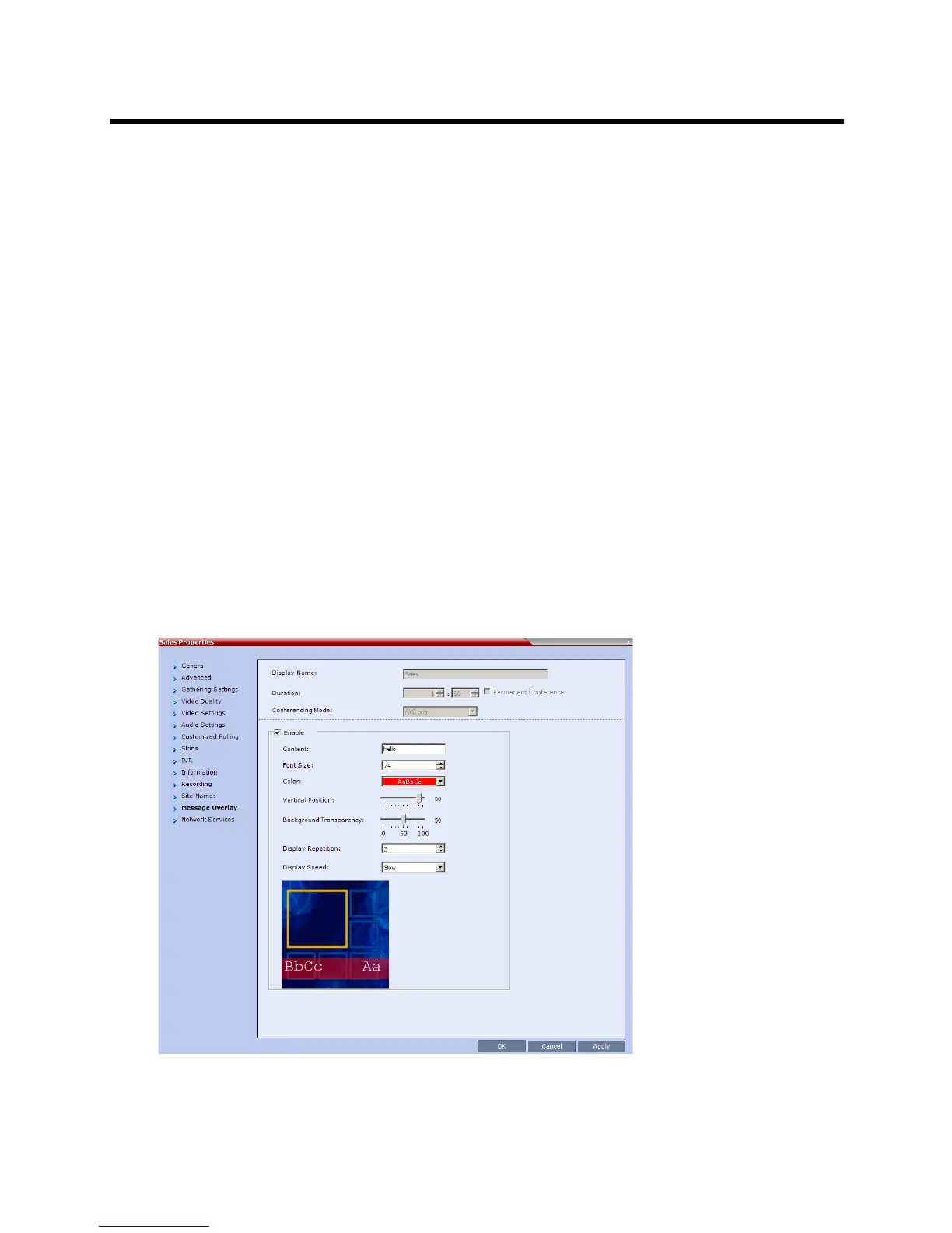 options in the Conference Properties – Message Overlay dialog box.