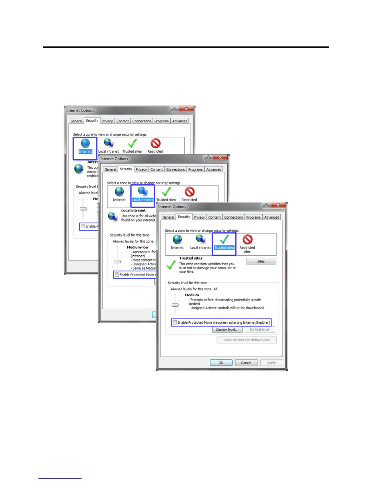 2 Clear the Enable Protected Mode check box for each of the following tabs:
