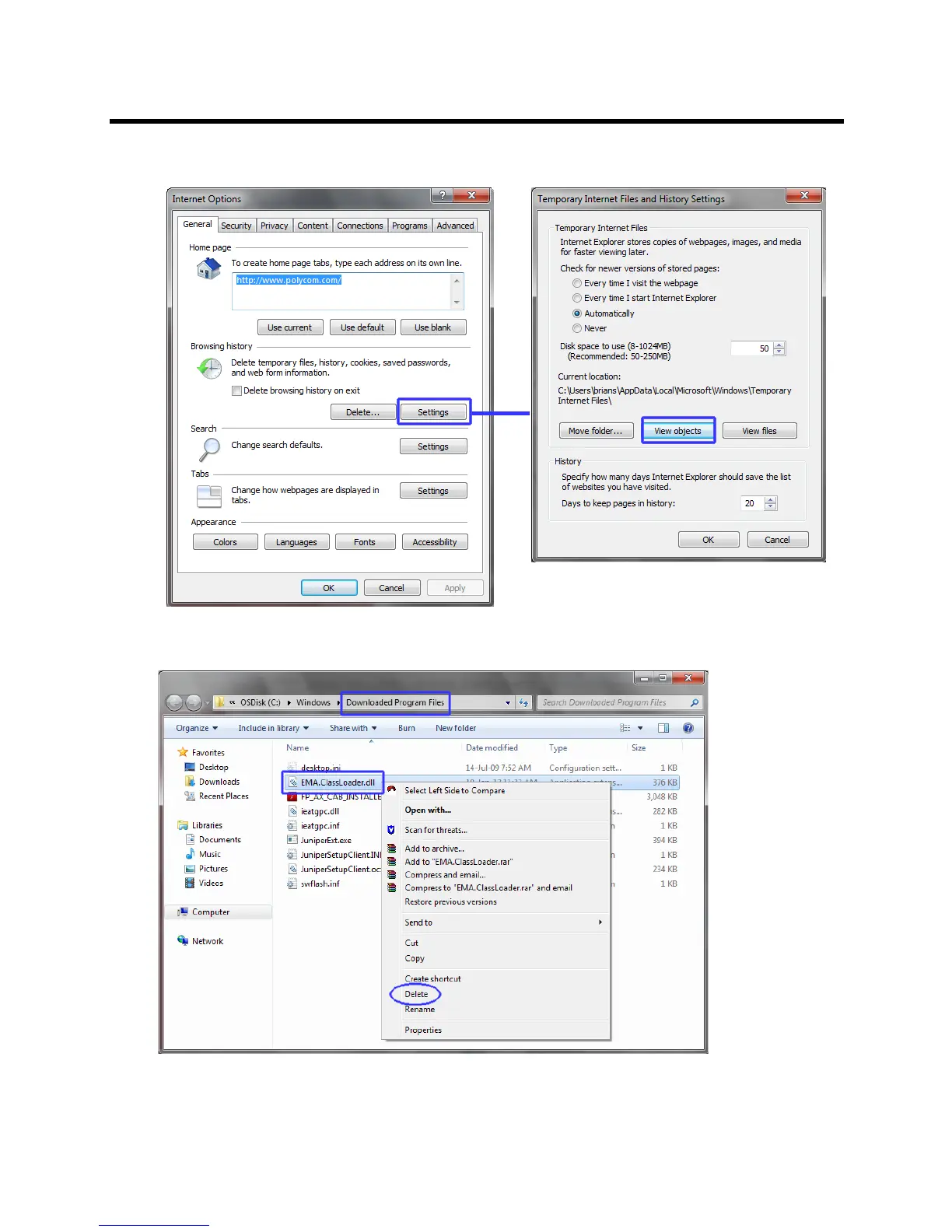 The Temporary Internet Files and History Settings dialog box is displayed.