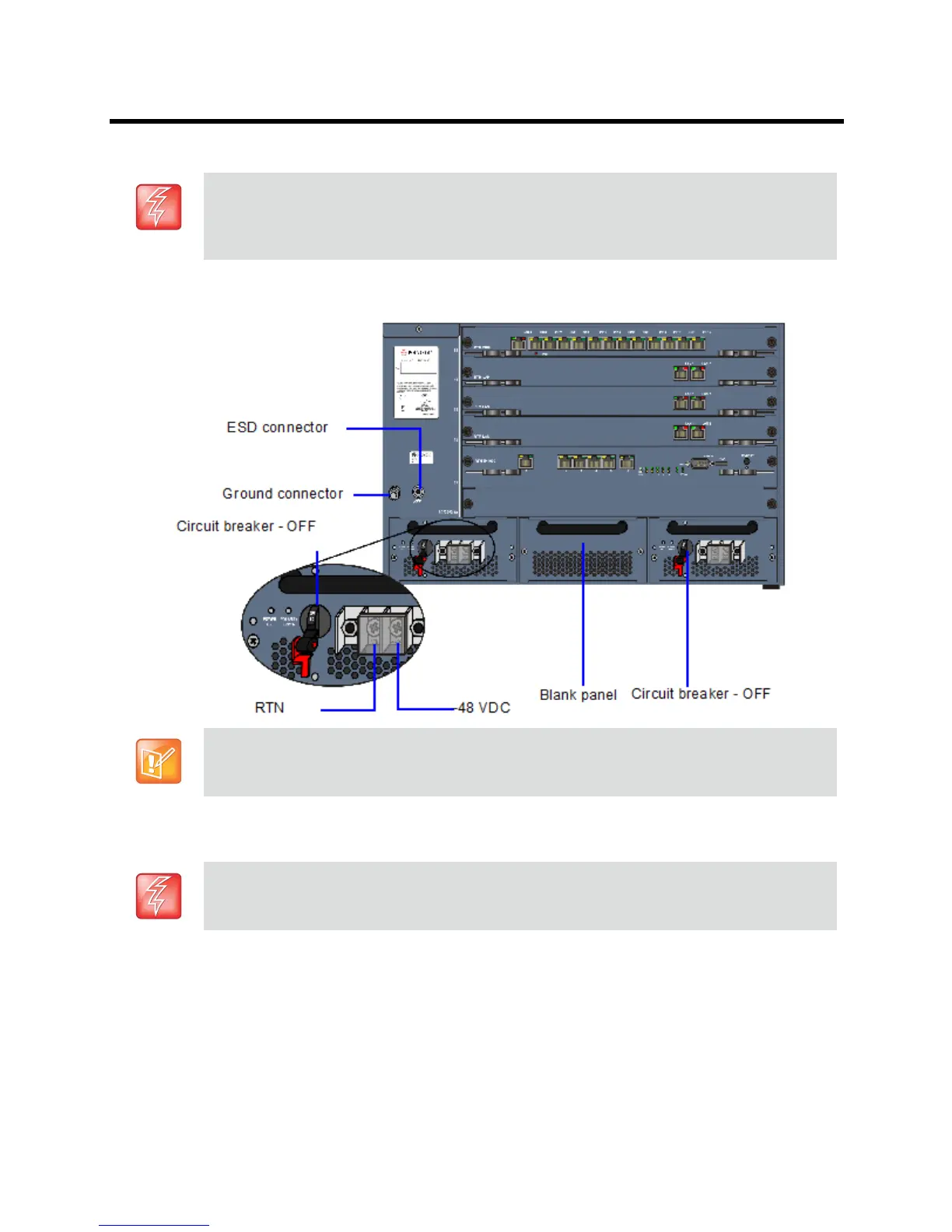 Using the two wires of a 10 AWG cable running from the DC power distribut ion unit, connect the black wire into the -48VDC terminal block and the red wire to the RTN terminal block.