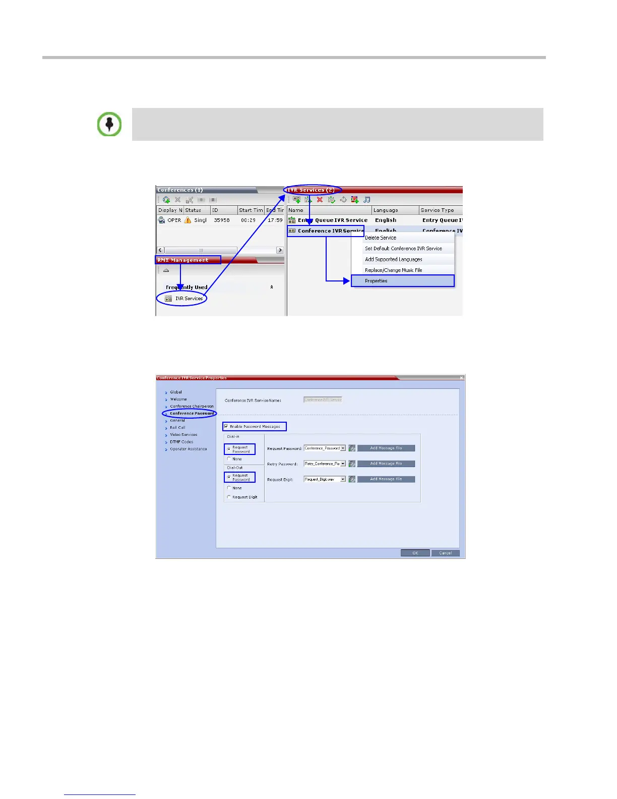 The Conference IVR Service Properties - Conference Password dialog box is displayed.