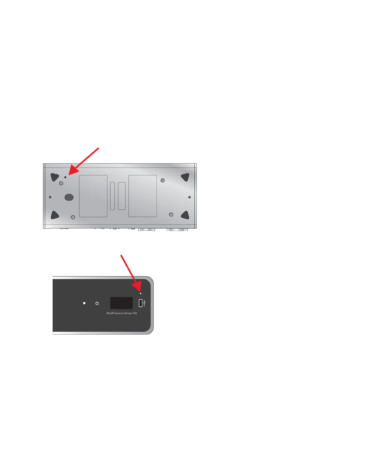 The restore button pinhole is on the front of the RealPresence Group 700 system, as shown in the