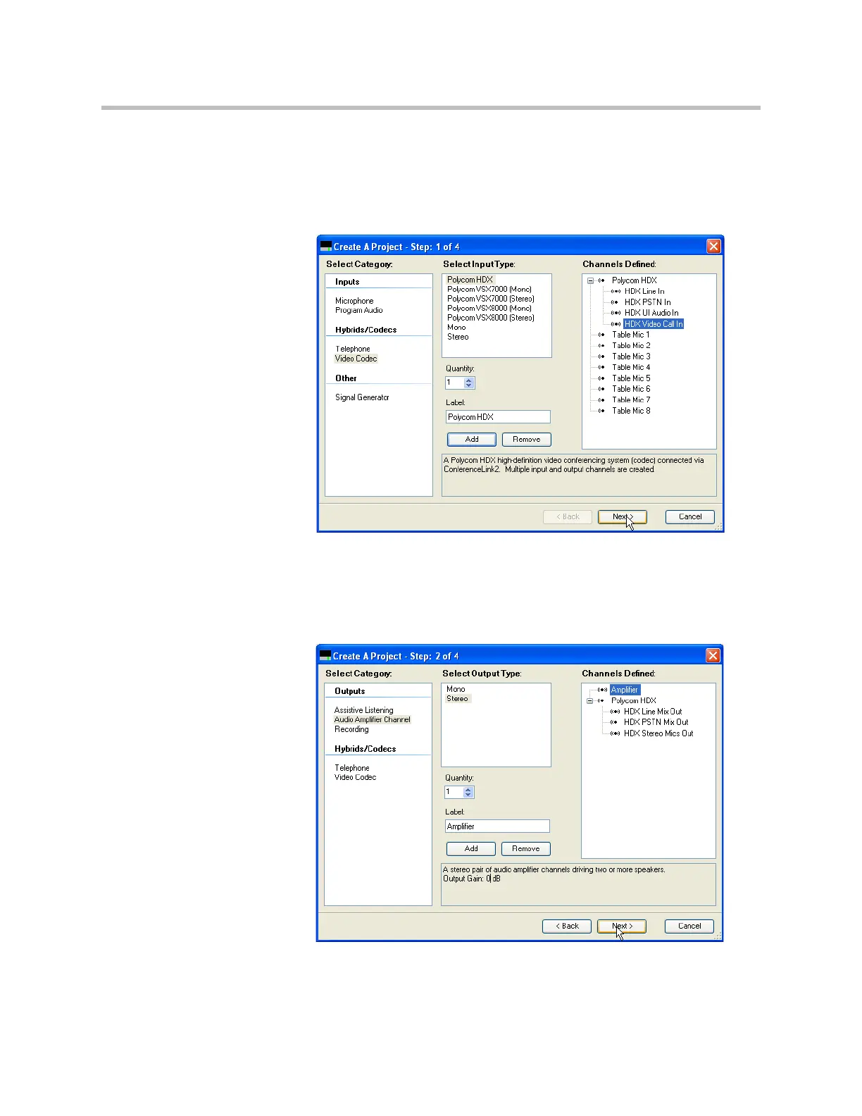 Select a stereo amplifier as the output source. Notice that the Polycom HDX is