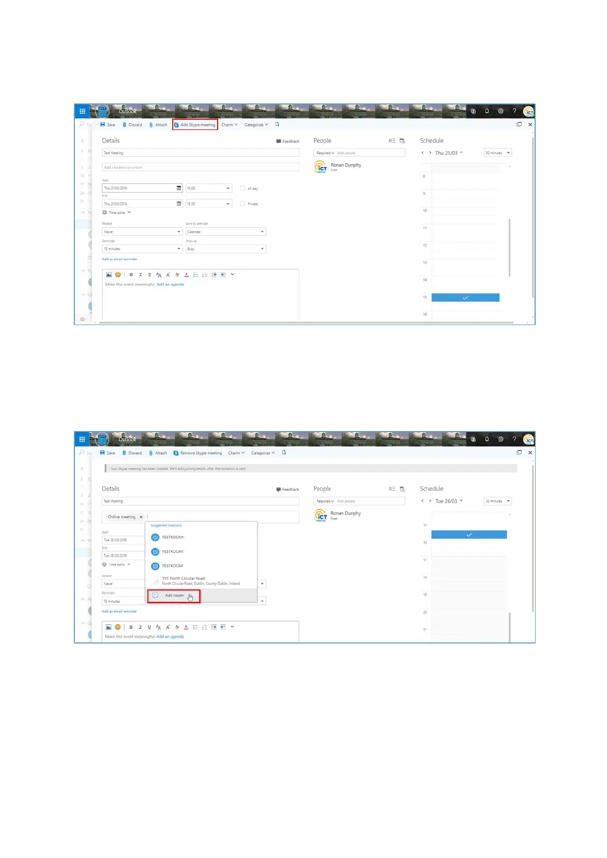 Step 7: Click the “Add Skype Meeting” button to include Skype for Business meeting details.