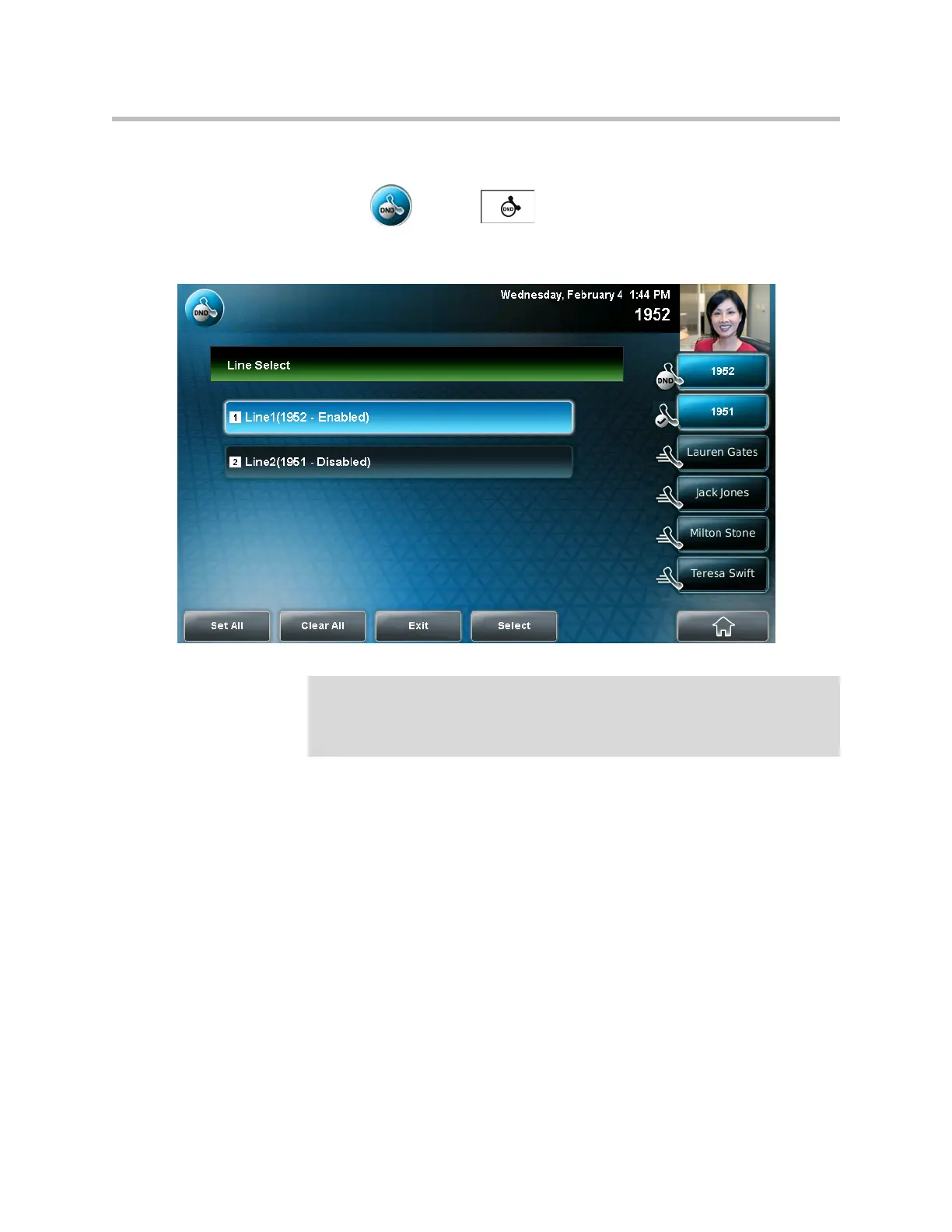 automatically enable Do Not Disturb for all lines, tap the Set All soft key. To