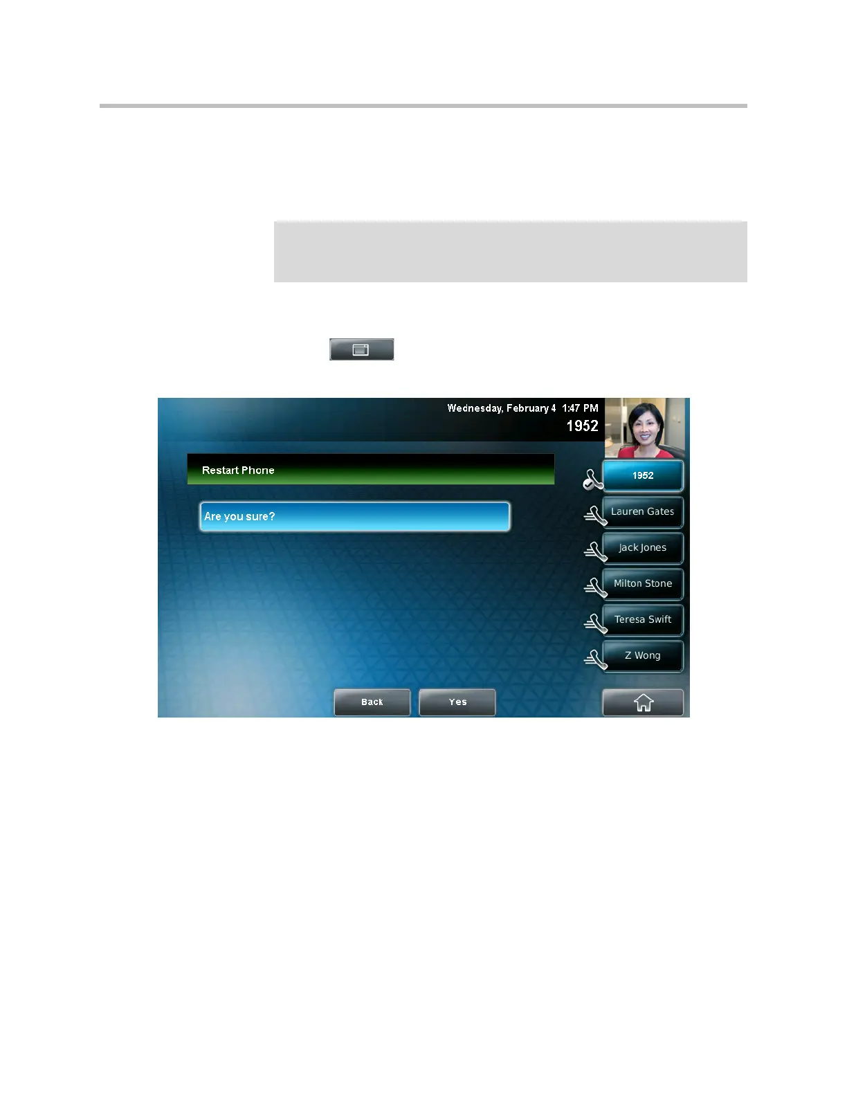 The Restart Phone screen displays. The message “Are you sure?” displays.