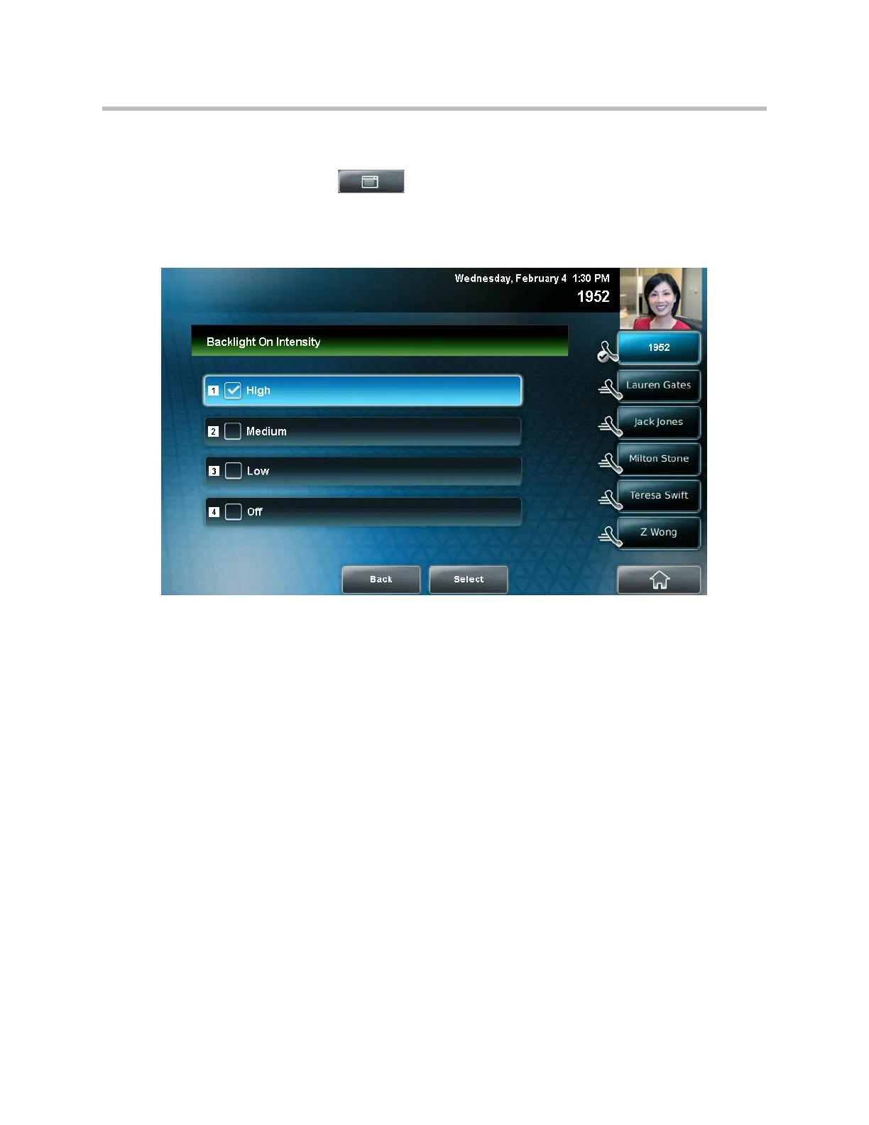 3. Tap the intensity you want, tap the Select soft key, and then tap the