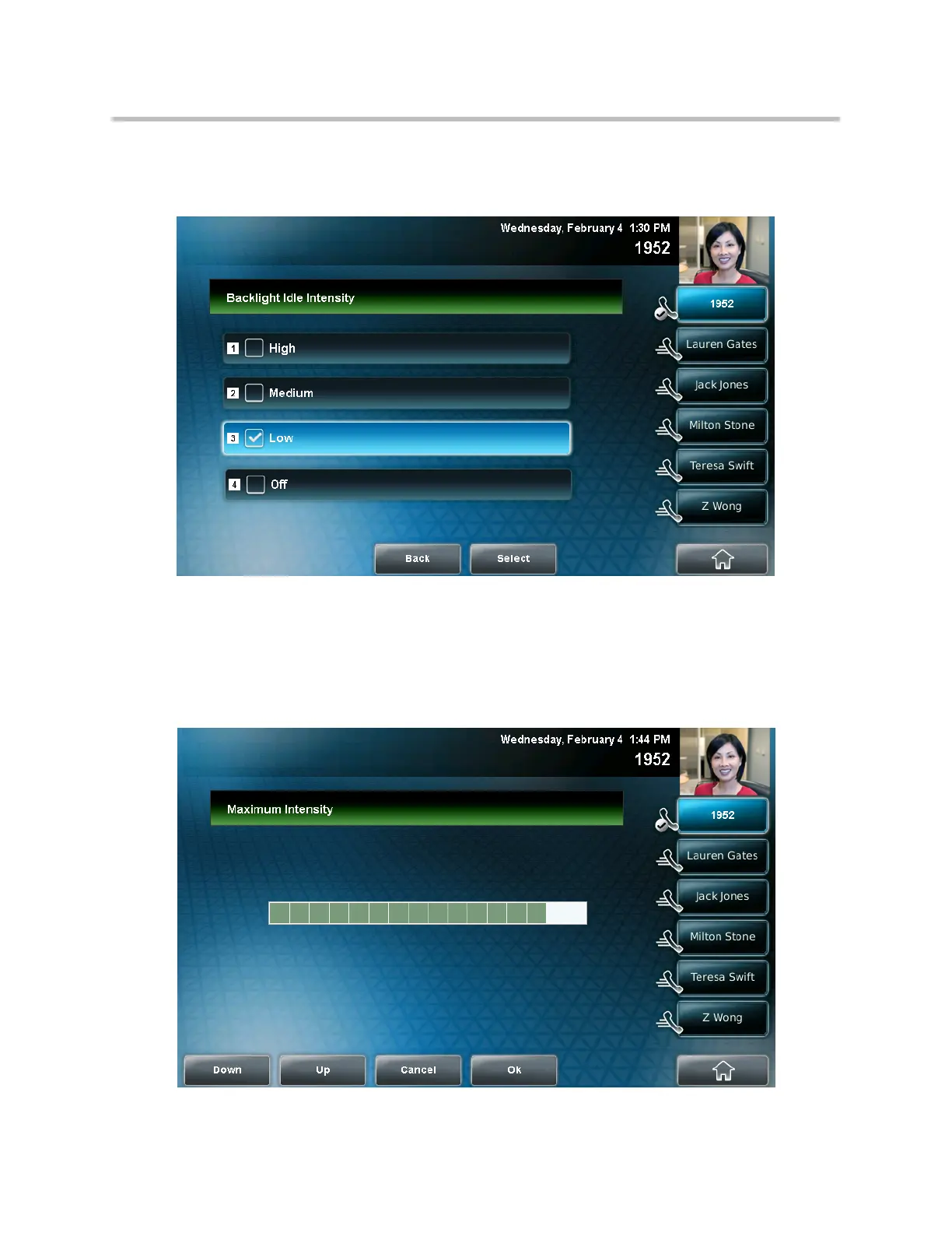 5. Tap the intensity you want, tap the Select soft key, and then tap the