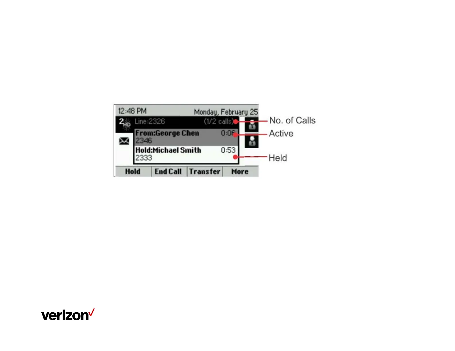 The Calls view displays active calls, held calls and number of calls