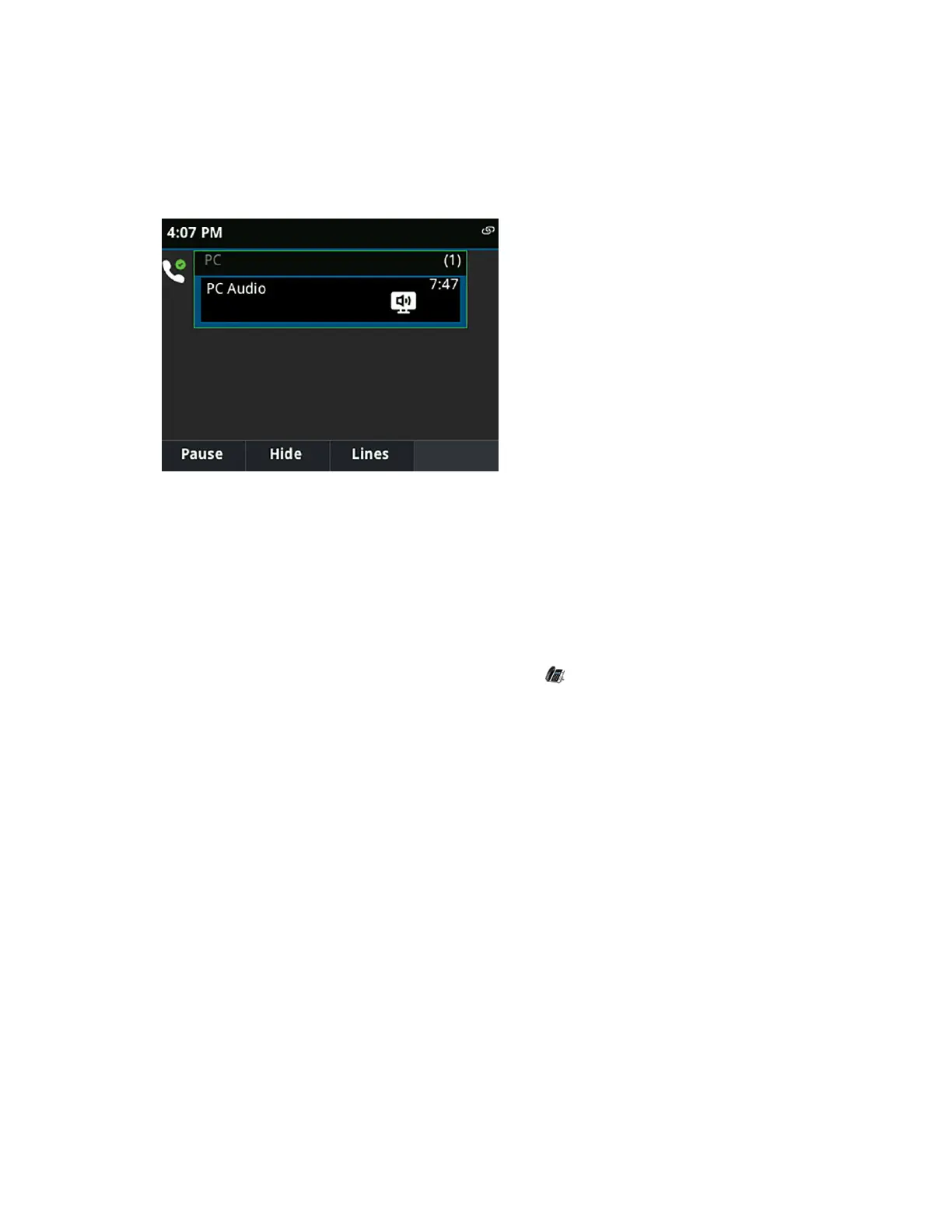 Any audio from music or videos plays on your VVX phone and the PC Audio screen is displayed,