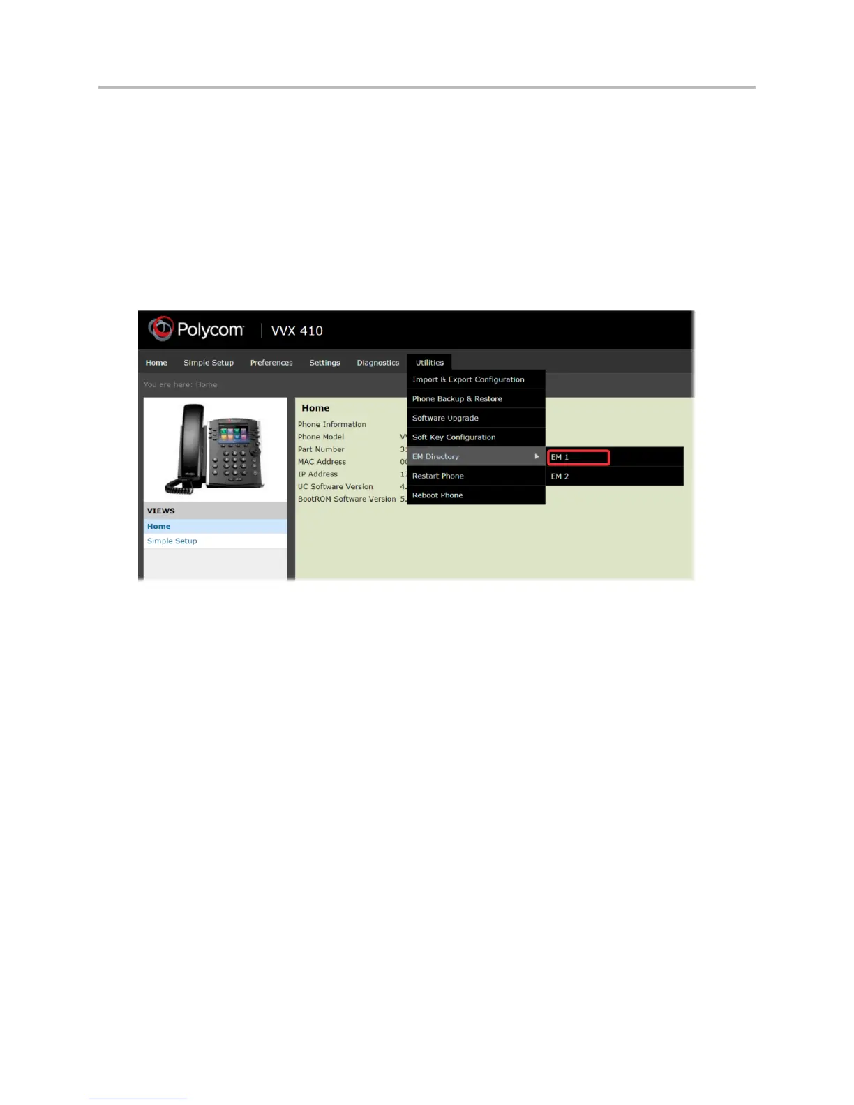 4 Select the VVX Expansion Module you want to generate a PDF for. For example, EM1 is chosen in