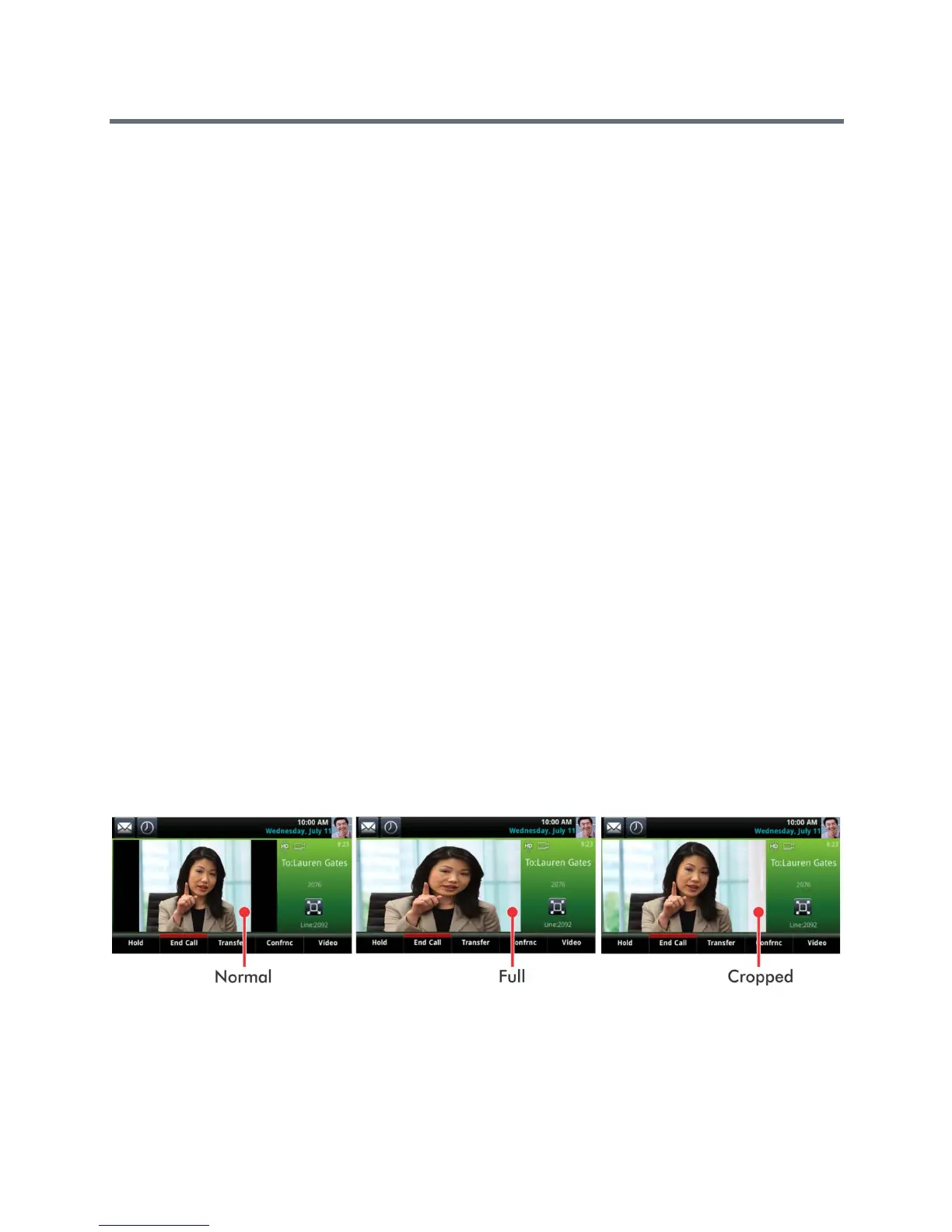 The following pictures show how normal, full, and cropped modes display in the Active Call screen.