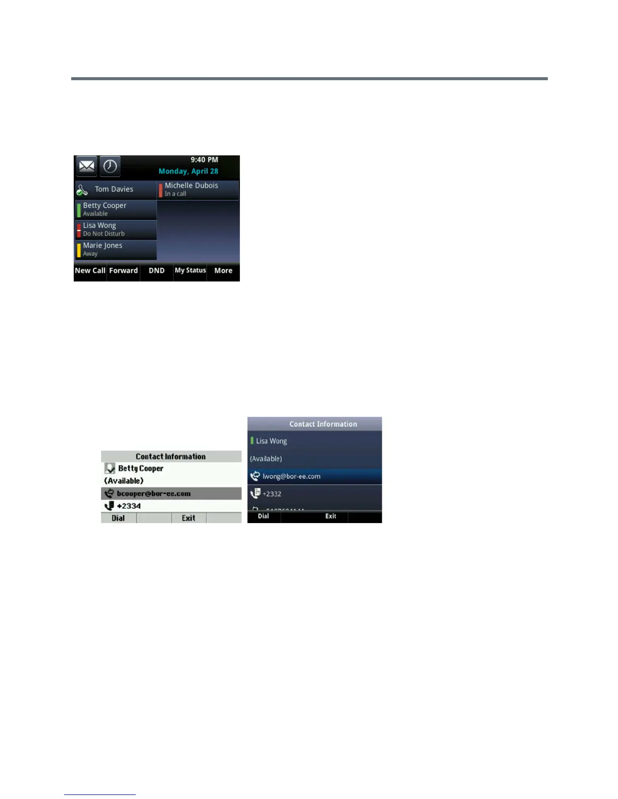 On VVX 201, 300/310, and 400/410 phones, only a contact’s presence status is displayed on the Lines