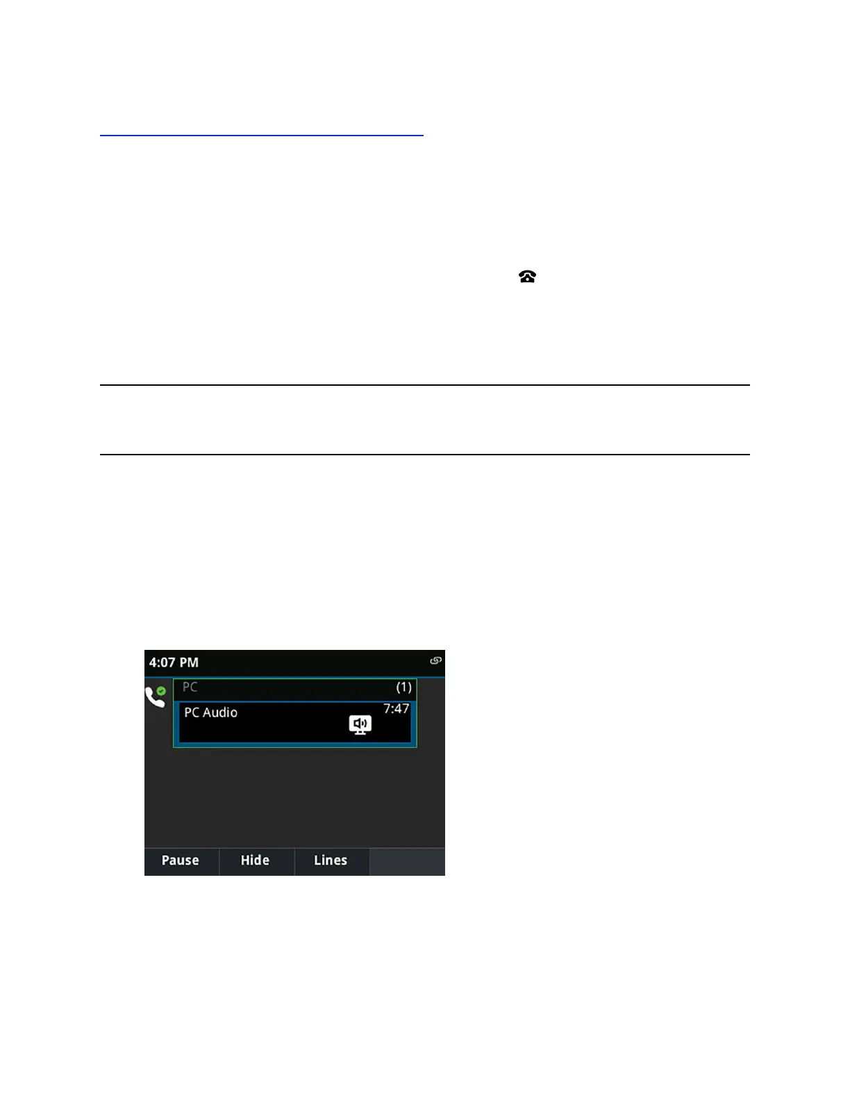 Any audio from music or videos plays on your VVX phone and the PC Audio screen is displayed,