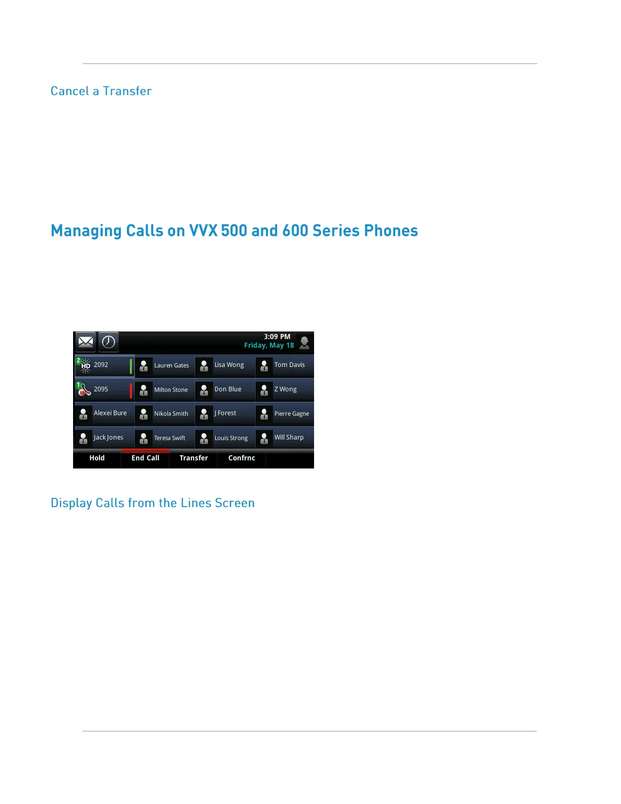 shown next. On all VVX business media phones, a green light on the line key indicates a line with an active call,