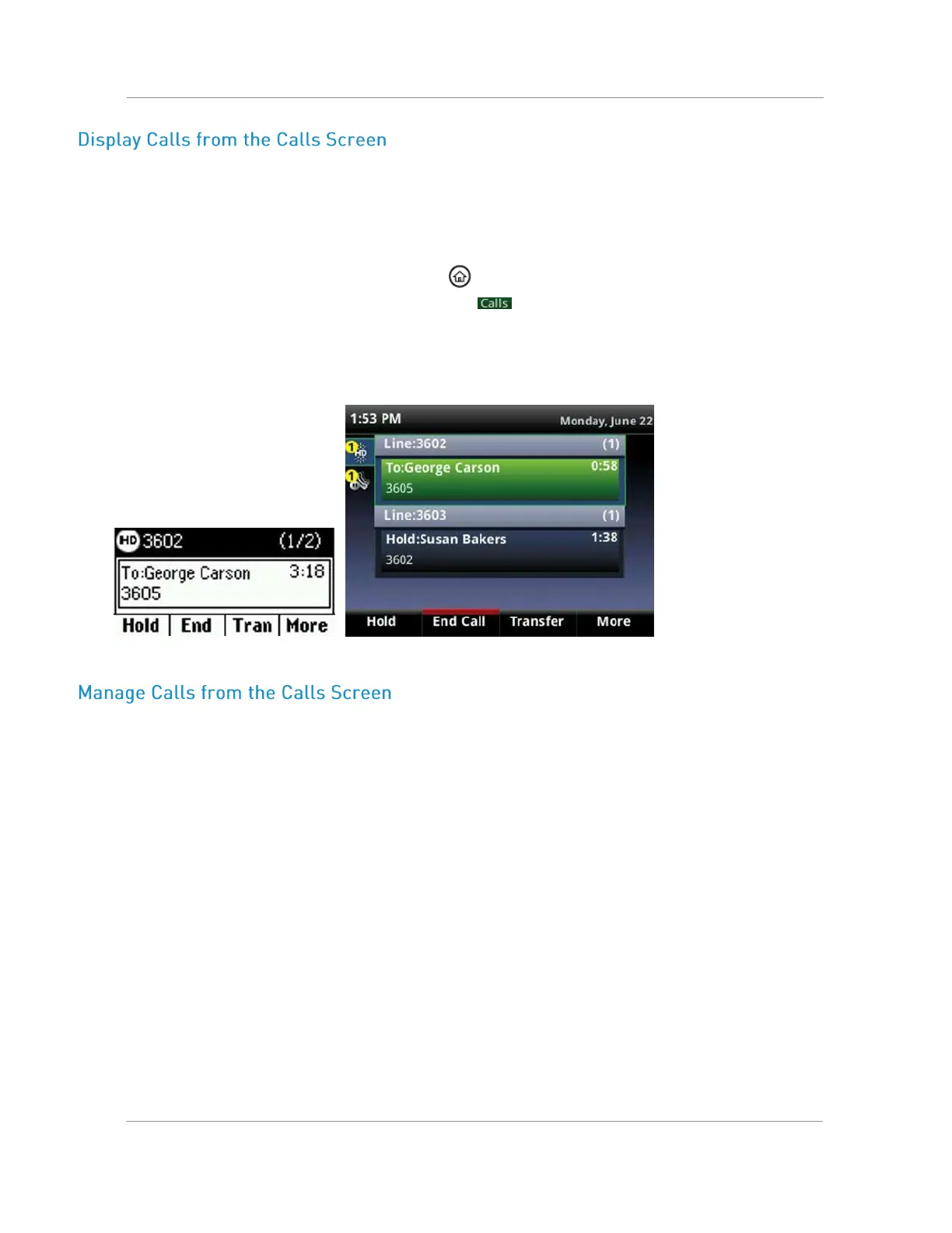 From the Calls screen, you can manage a call by holding, resuming, or transferring the call, or you can initiate