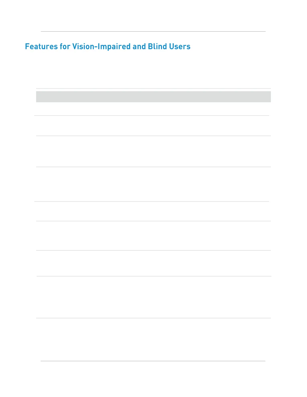The following table lists the accessibility features on VVX business media phones for visually-impaired and blind
