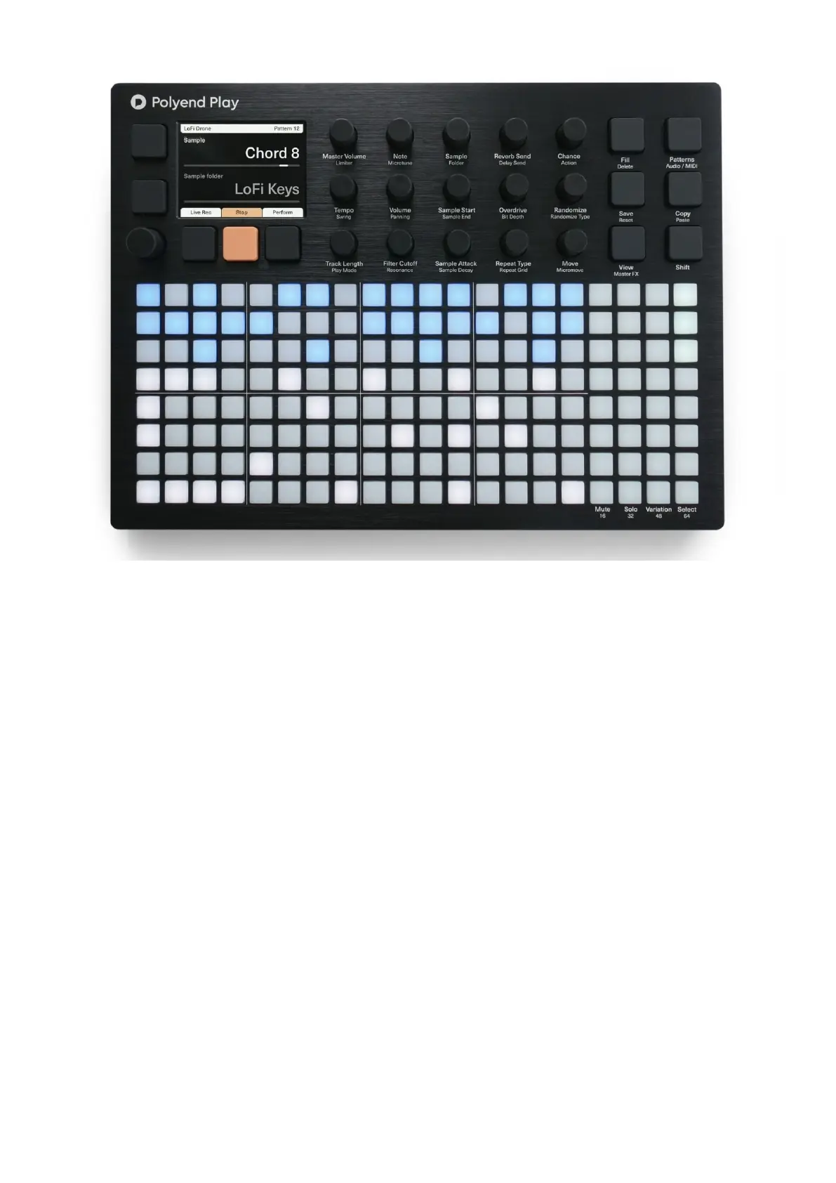 The Polyend Play user interface is divided into four sections. Starting from the left side: